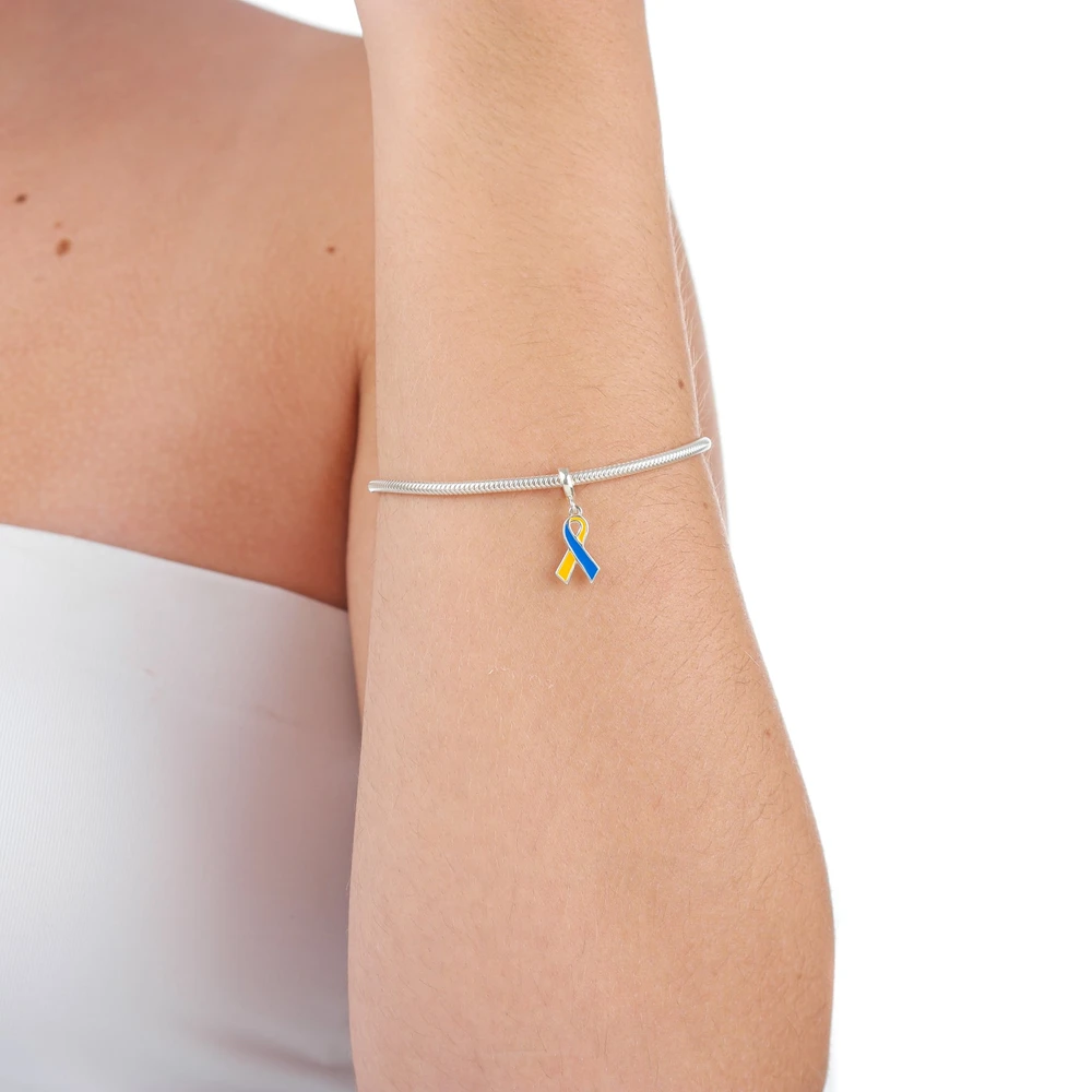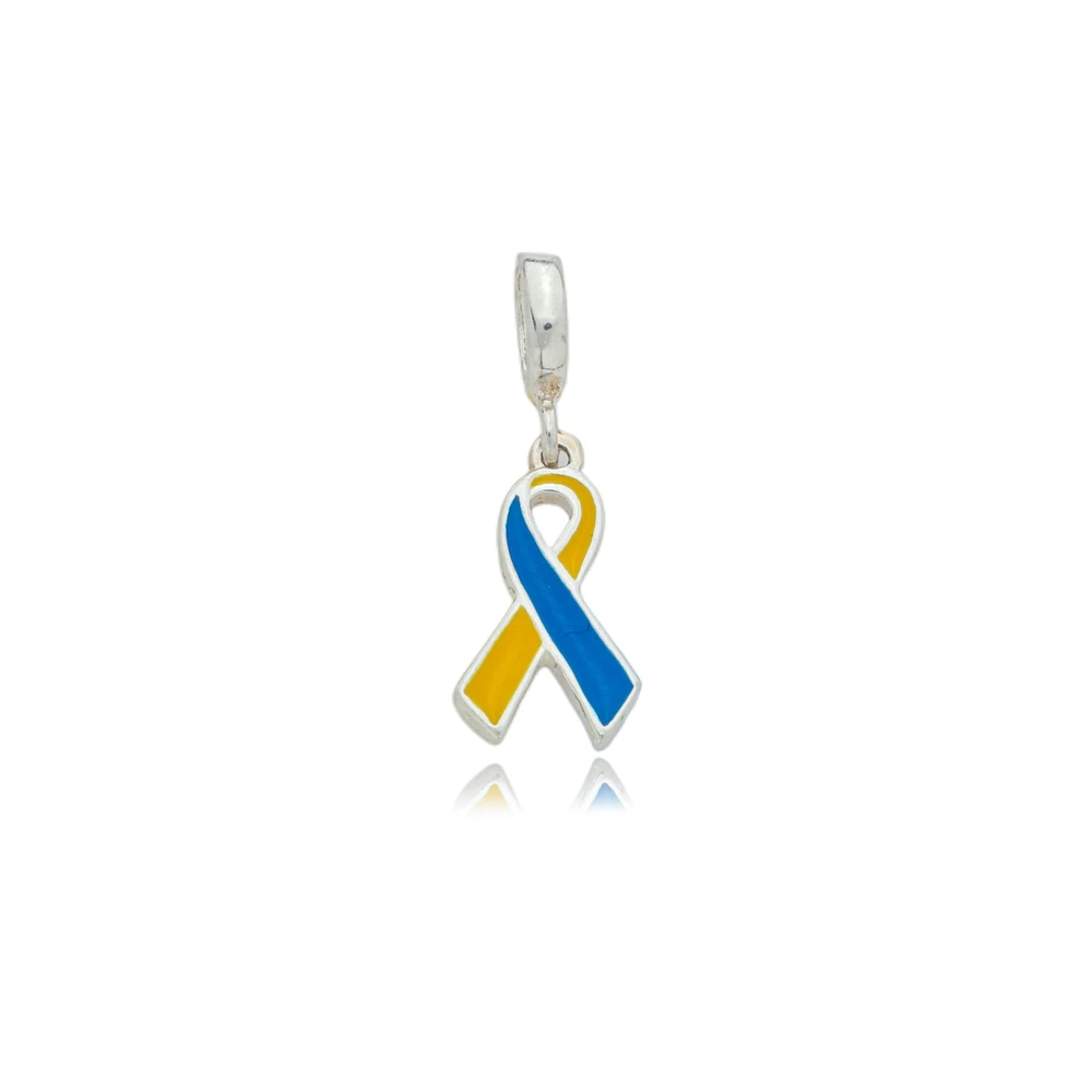 Berloque Símbolo Síndrome de Down O símbolo mais reconhecido do T21 ou Síndrome de Down é a fita de consciência, as cores da fita são azul e amarelo, cores vibrantes que representam a alegria, a vitalidade e a positividade associadas às pessoas com Síndrome de Down.
