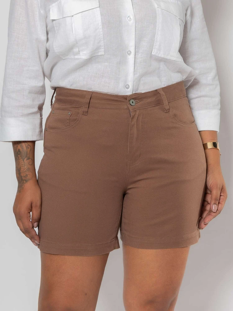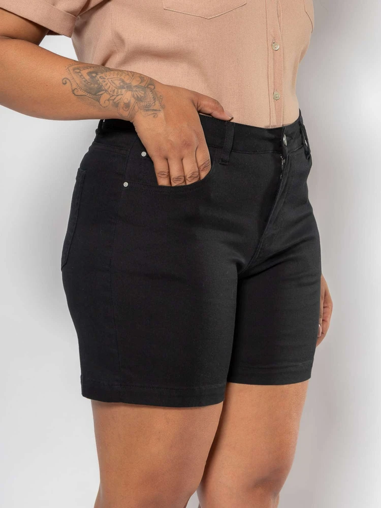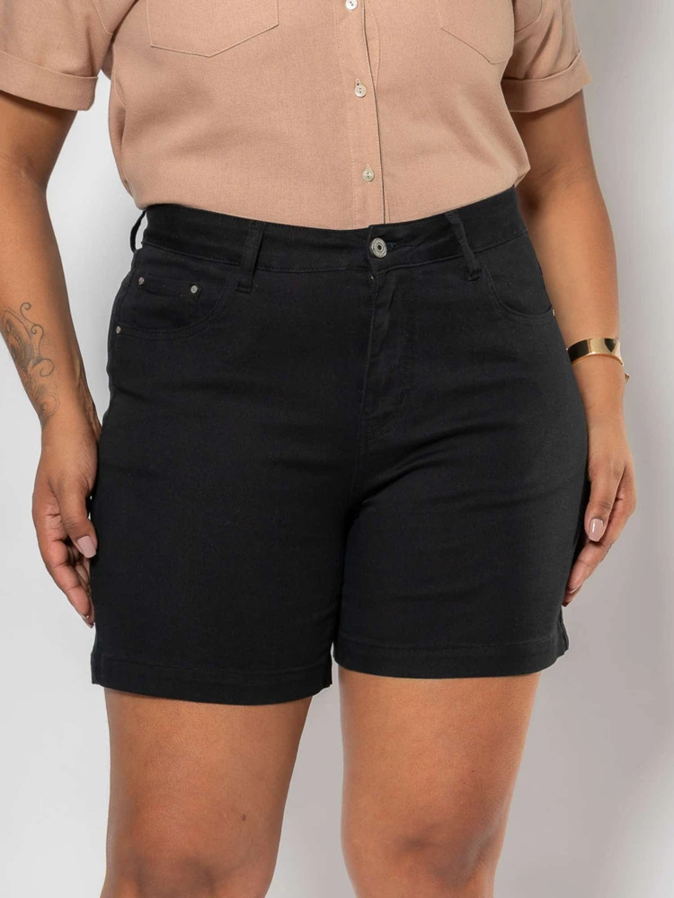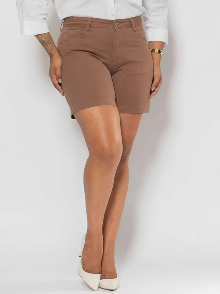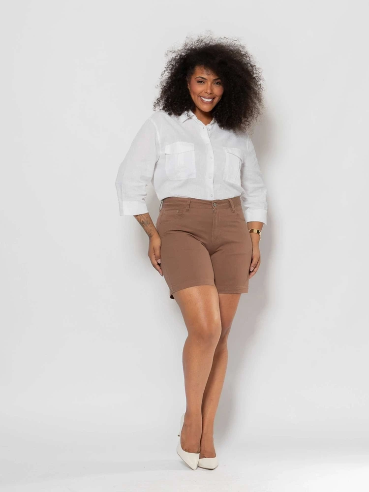 Bermuda feminina de comprimento meia coxa, confeccionada em sarja macia e estruturada, com cós intermediário que valoriza o corpo sem perder o conforto.