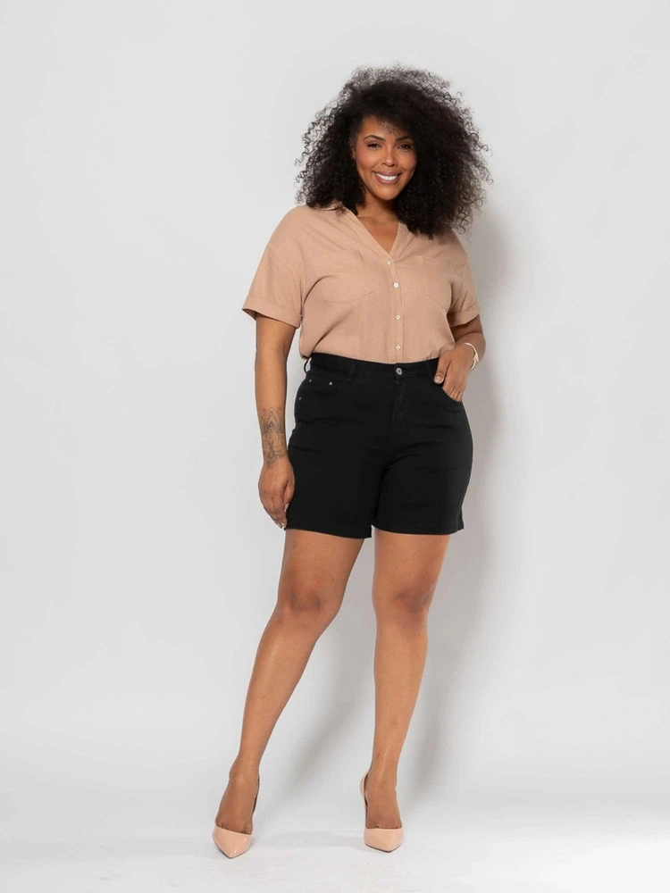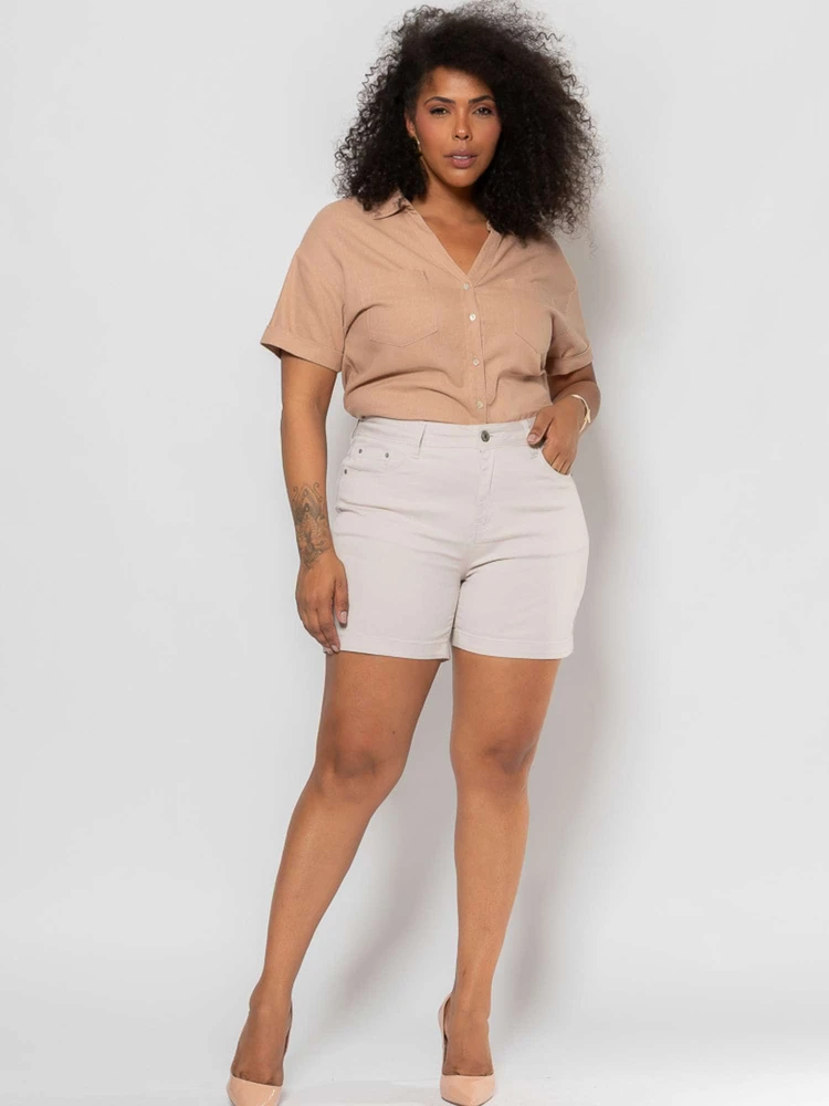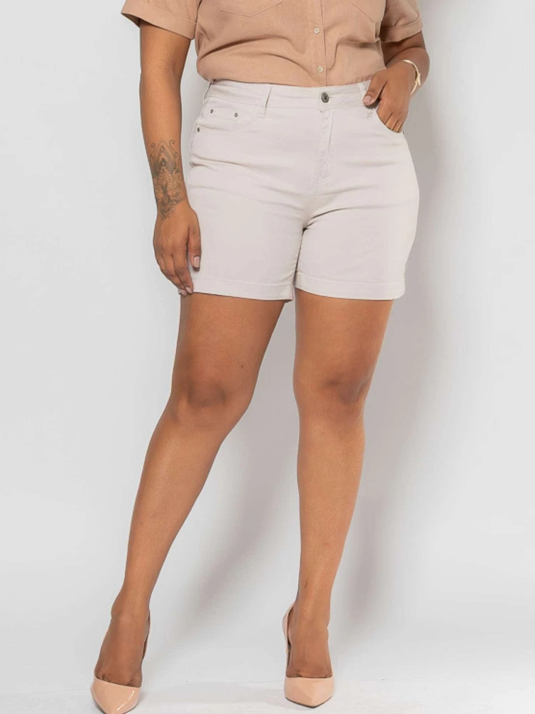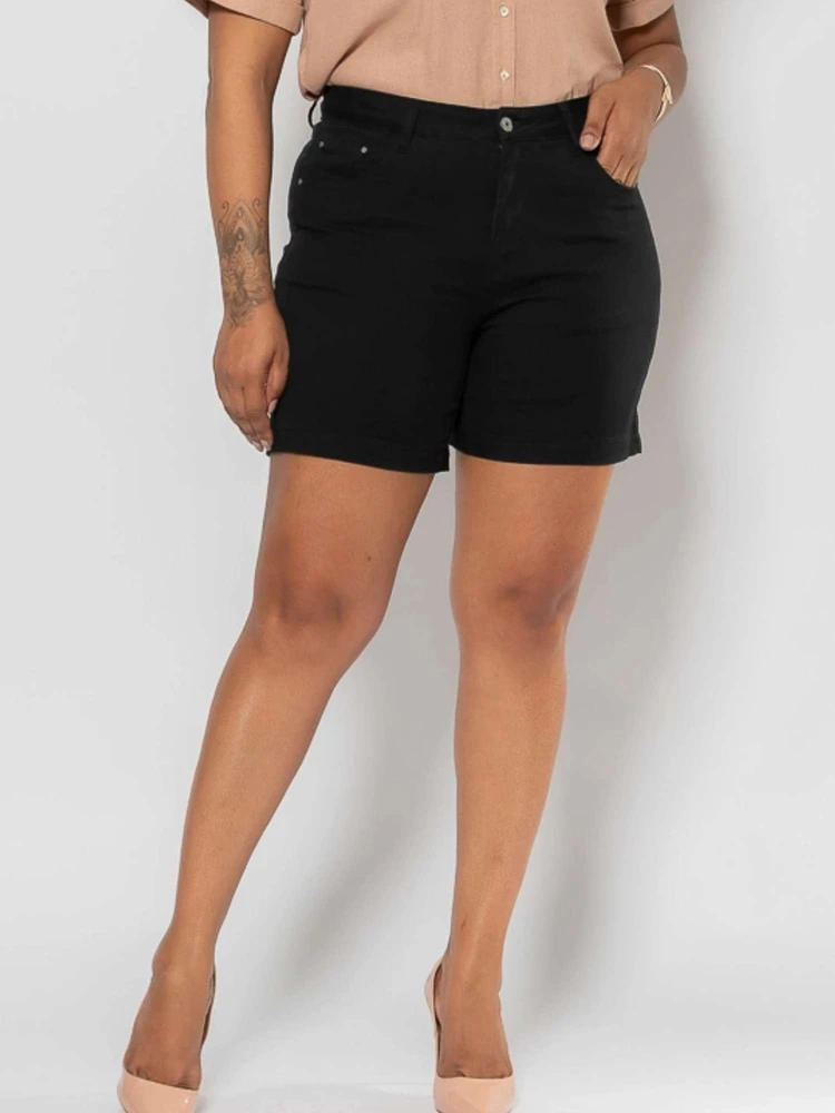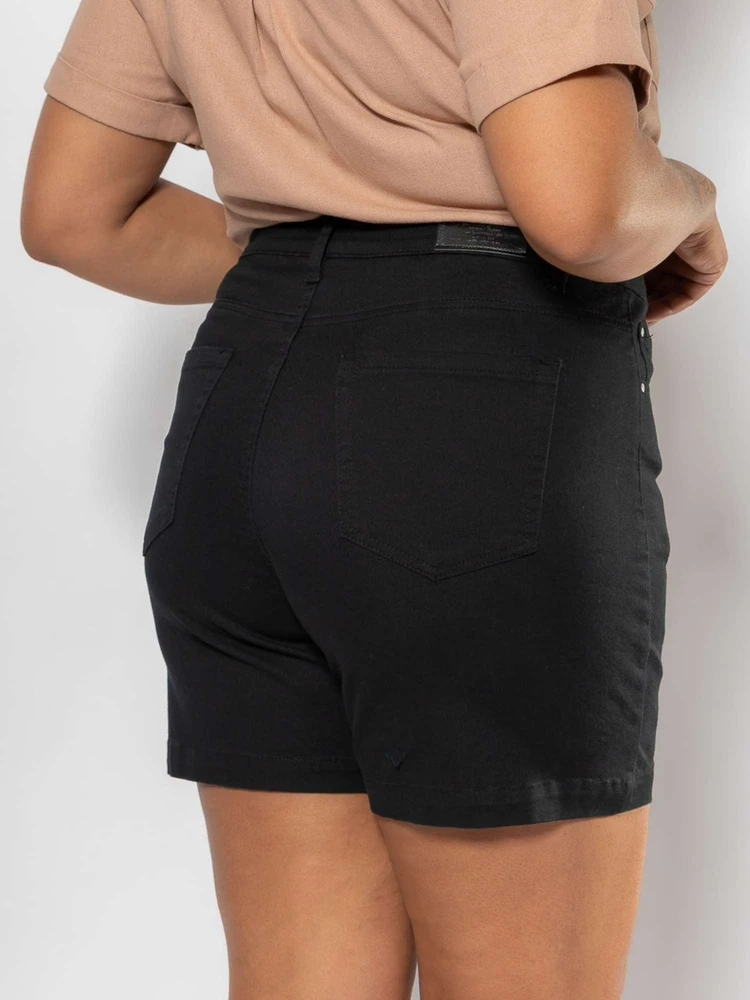 Bermuda feminina de comprimento meia coxa, confeccionada em sarja macia e estruturada, com cós intermediário que valoriza o corpo sem perder o conforto.