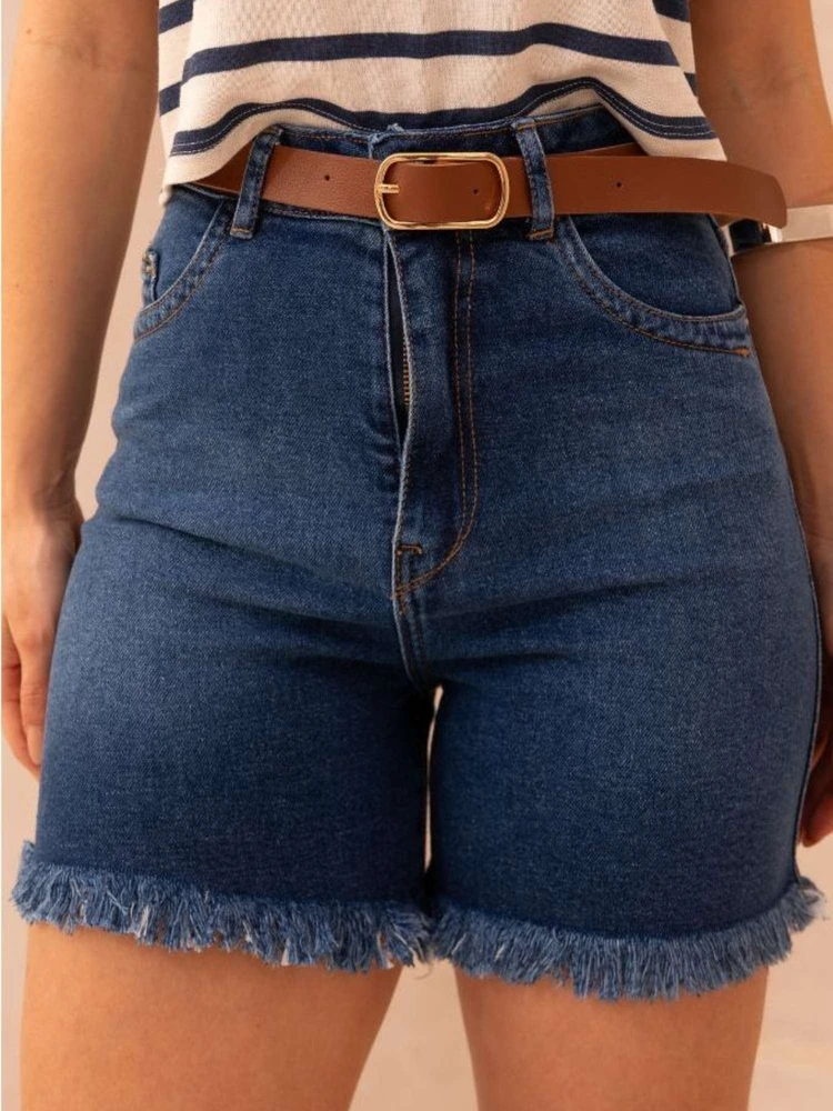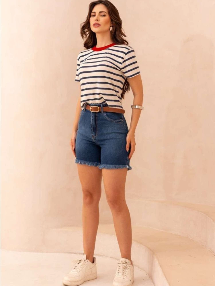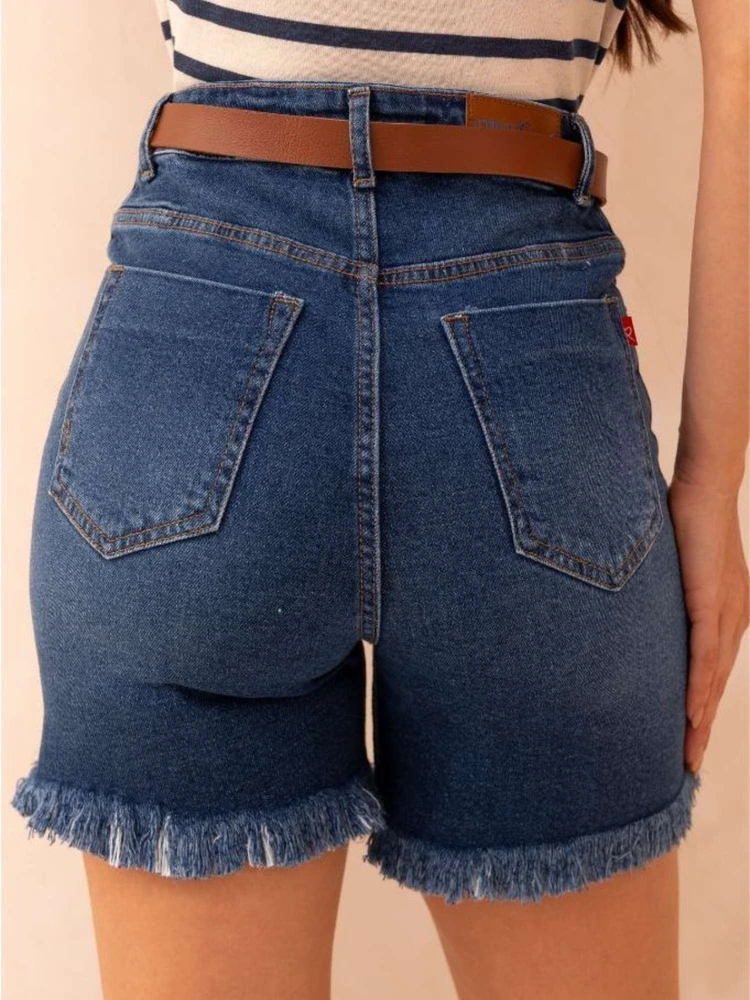 Bermuda feminina confeccionada em jeans encorpado e resistente, modelagem meia coxa com barra desfiada, que adiciona um toque moderno e despojado ao look.