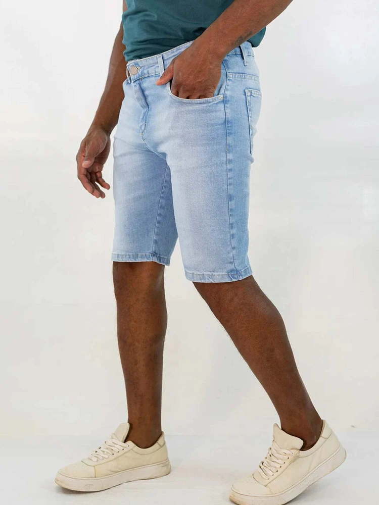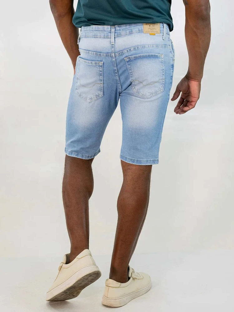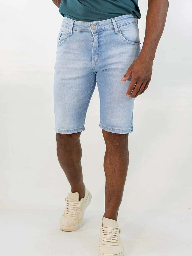 Bermuda masculina jeans, modelagem skinny, com lavagem clara e estilo moderno.