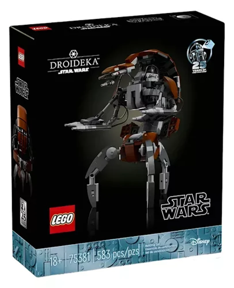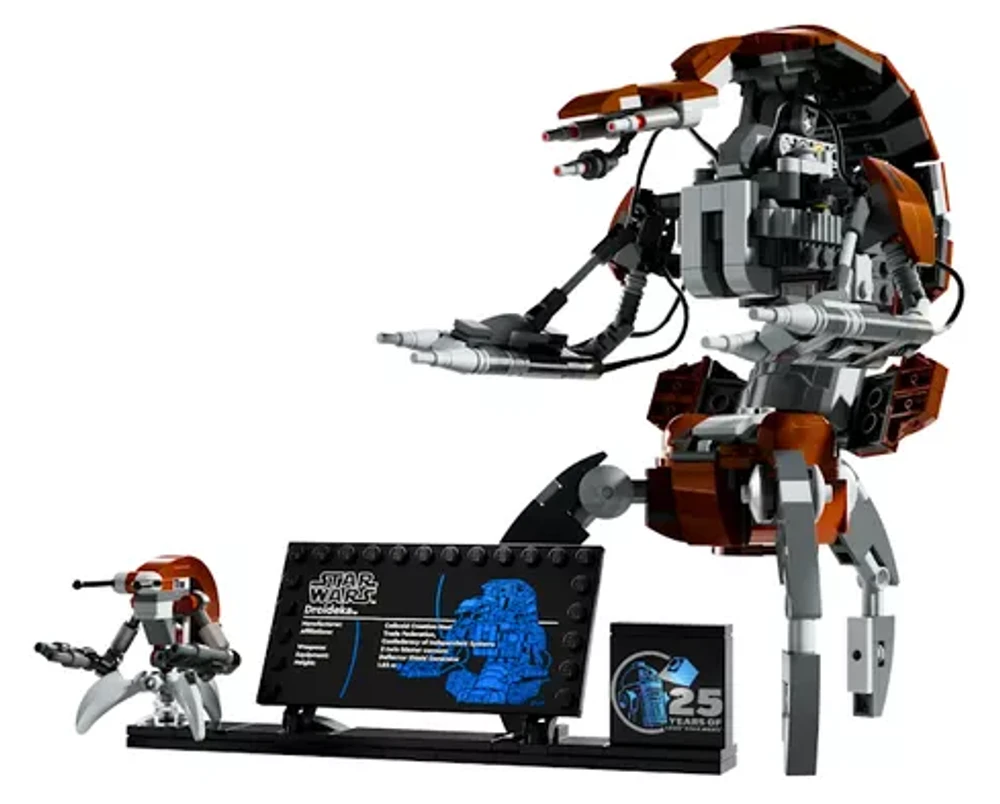 Para completar uma peça central impressionante, este conjunto de construção criativo também tem um suporte com uma placa informativa, uma peça LEGO Star Wars do 25º aniversário e espaço para a pequena figura LEGO incluída de um Droideka.