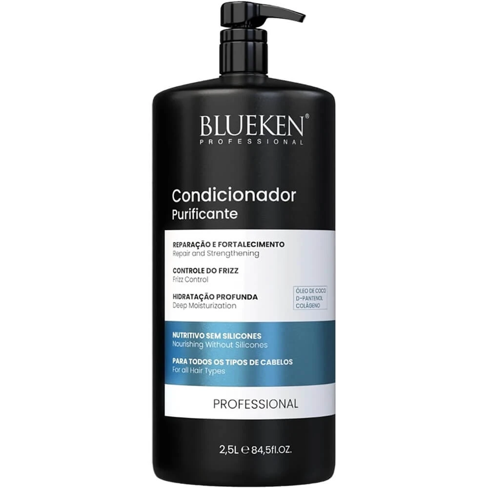 O Condicionador Purificante Lavatório Blueken rende mais de 180 aplicações. Promove proteção contra ressecamento, nutrição profunda da fibra capilar, controle de frizz, hidratação, brilho, maciez, umectação e emoliência aos fios.