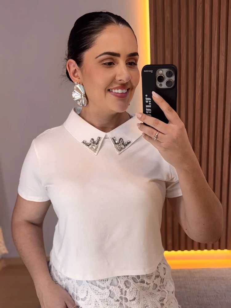 Confeccionada em tecido leve, de toque macio e caimento confortável, essa blusa oferece praticidade para o dia a dia sem abrir mão do estilo. O grande destaque fica por conta da gola estruturada com aplicações em pedraria, que traz brilho sutil e um acabamento refinado, elevando instantaneamente qualquer produção.