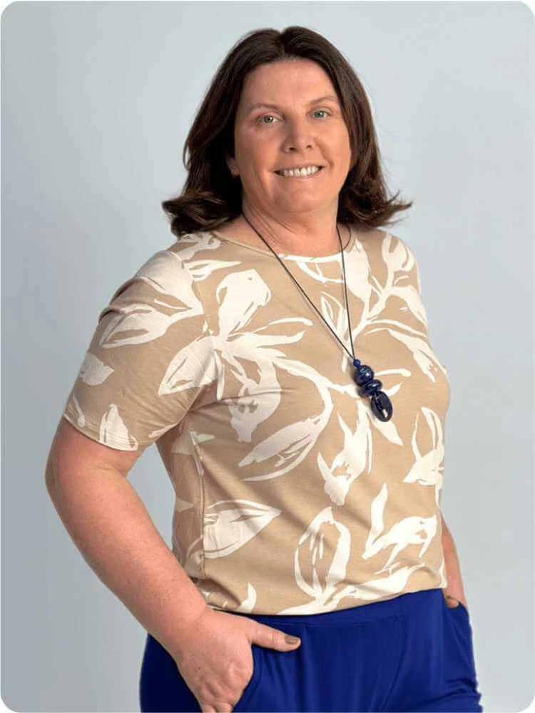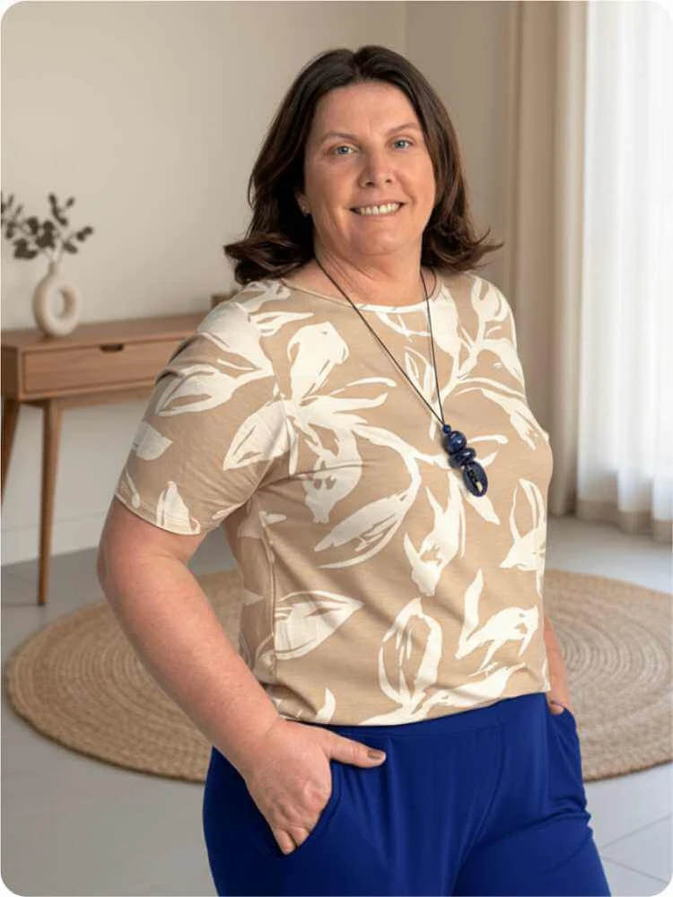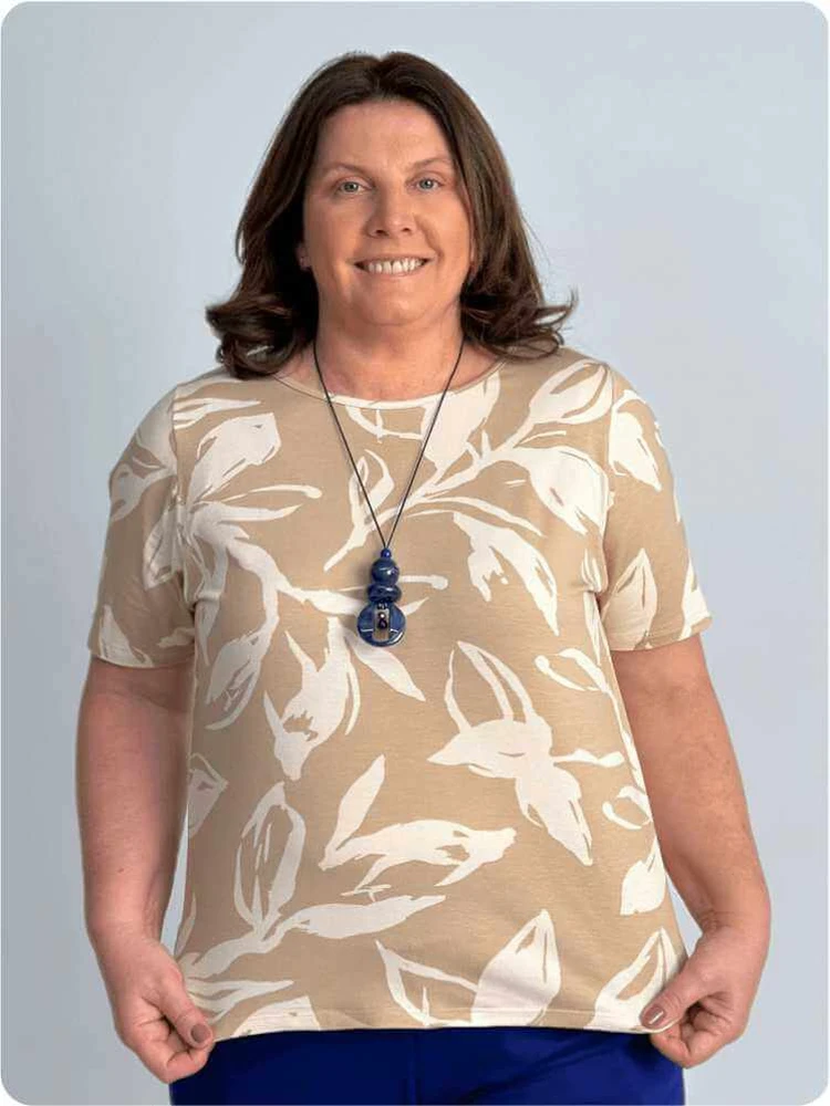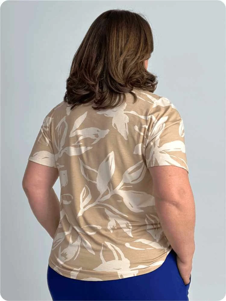Blusa Bege Malha Soltinha Estampada Manga Curta