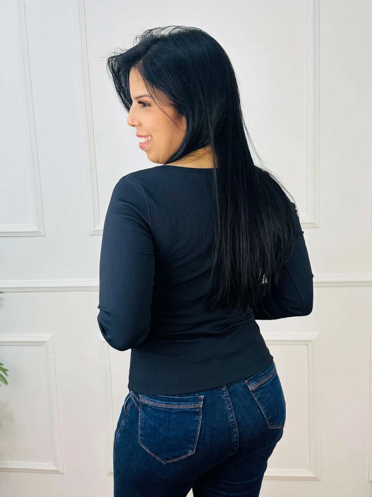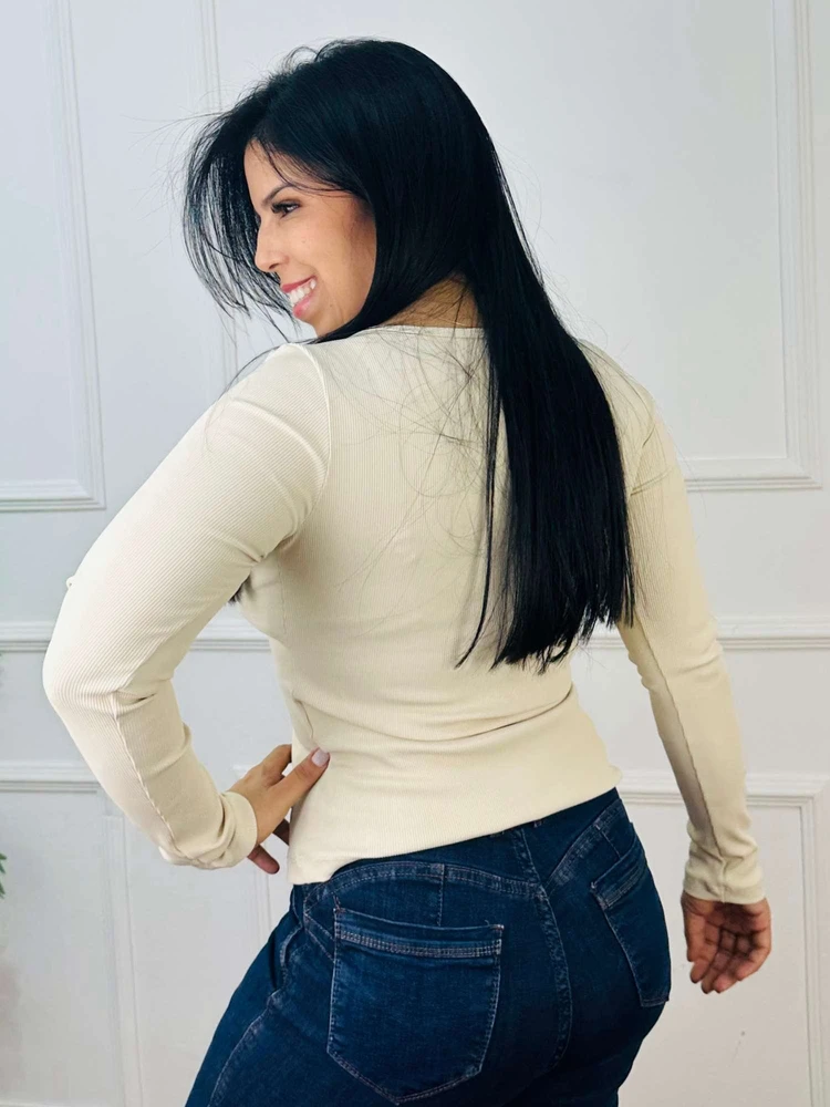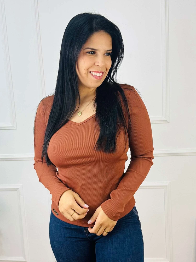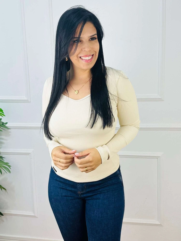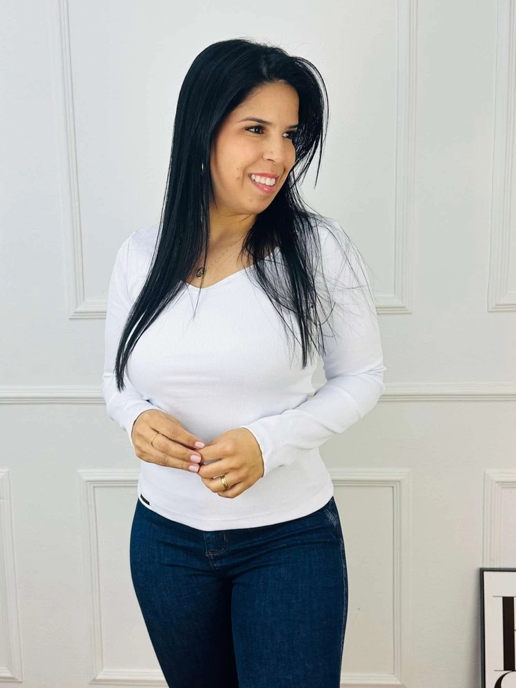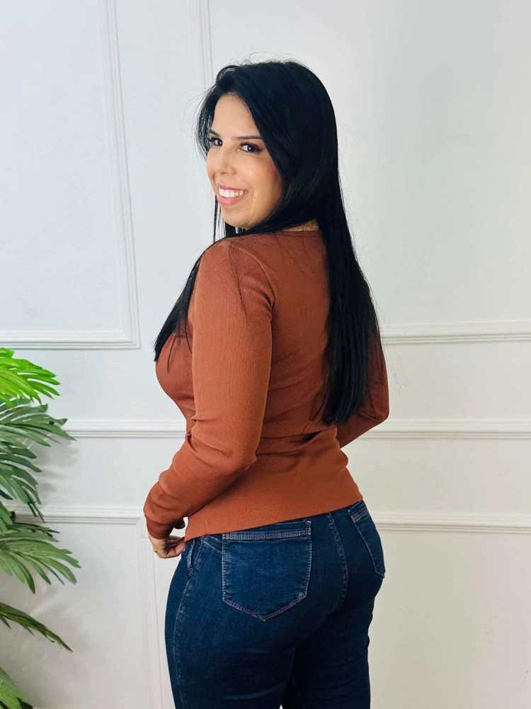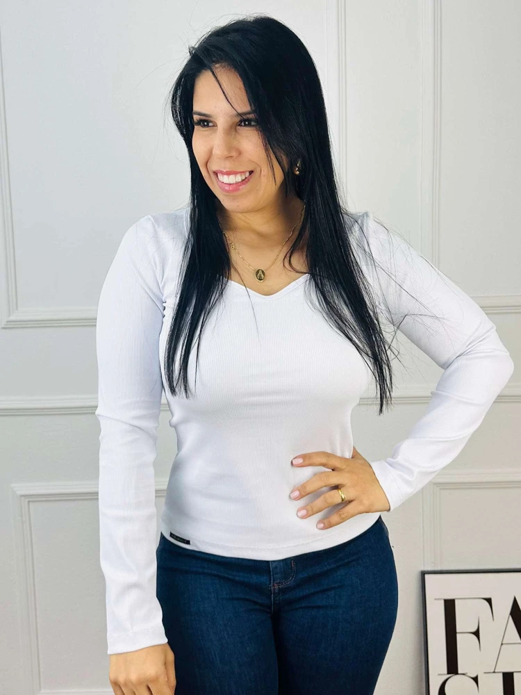 A blusa manga longa da marca K2B Jeans traz sofisticação com um toque moderno. Seu decote princesa valoriza o colo com delicadeza, enquanto o tecido canelado em poliamida com elastano proporciona ajuste perfeito ao corpo, conforto térmico e alta elasticidade.