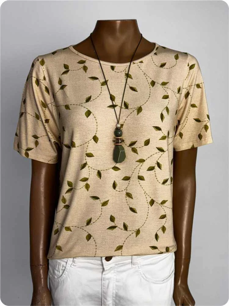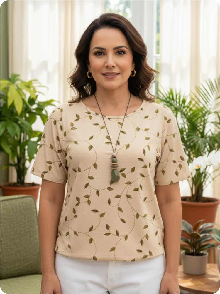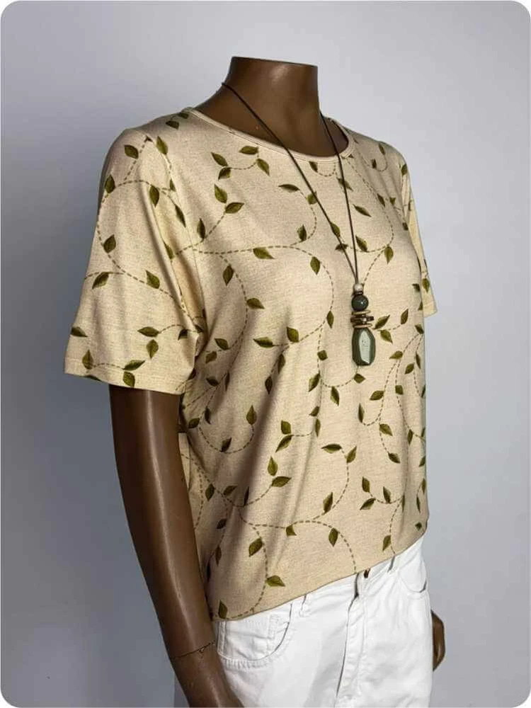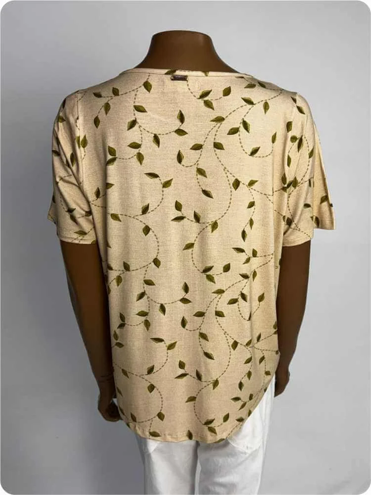Blusa Feminina Bege Folhagem Verde Malha Soltinha Manga Curta