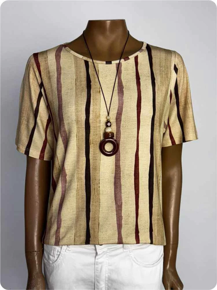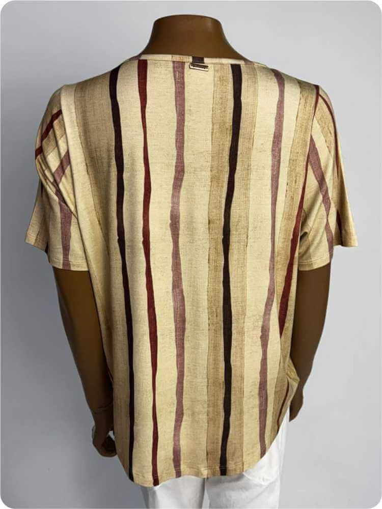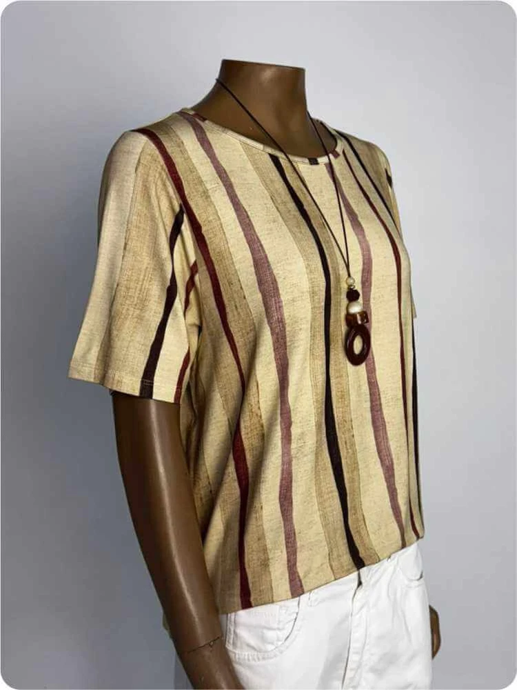 Blusa feminina bege listrada em tons terrosos, feita em malha leve e soltinha, perfeita para o dia a dia com conforto e estilo. Seu design com listras verticais valoriza a silhueta, proporcionando um visual elegante e moderno. Ideal para compor looks casuais ou mais sofisticados, essa blusa combina facilmente com jeans, calças claras ou saias neutras, oferecendo versatilidade no guarda-roupa.