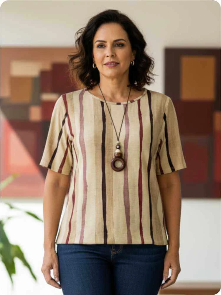 Escolha a blusa feminina bege listrada para unir conforto, tendência e praticidade em uma peça que se destaca pela beleza discreta e fácil combinação.