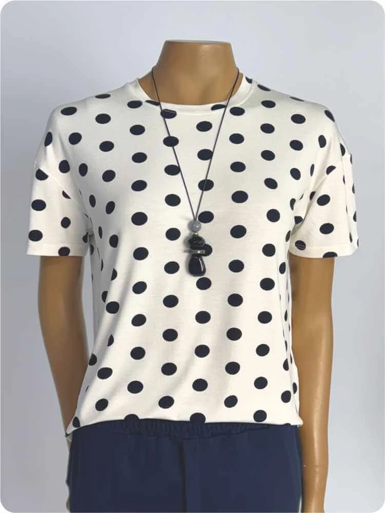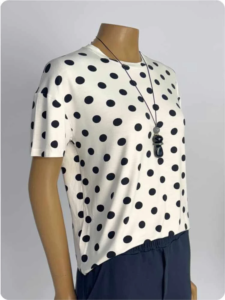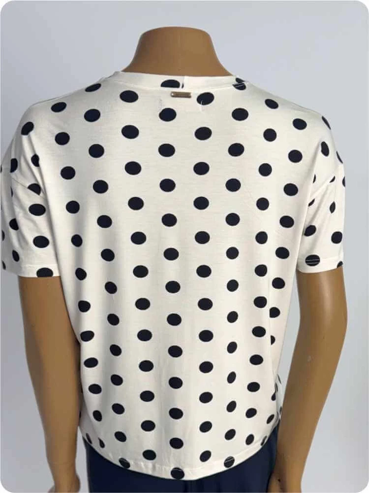 - Cor: Branca com Estampa Poá Preta
