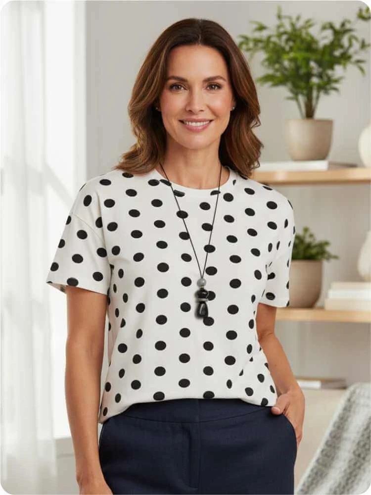 Blusa feminina branca com estampa clássica de poá, confeccionada em malha leve e confortável, ideal para quem busca estilo aliado ao bem-estar. O caimento soltinho e a gola redonda proporcionam liberdade de movimento e versatilidade, perfeito para compor looks casuais ou sociais com elegância. Seu design atemporal com bolinhas pretas destaca a personalidade sem perder a sofisticação. Invista em uma peça que une qualidade, conforto e charme para o dia a dia. Destaques do produto: