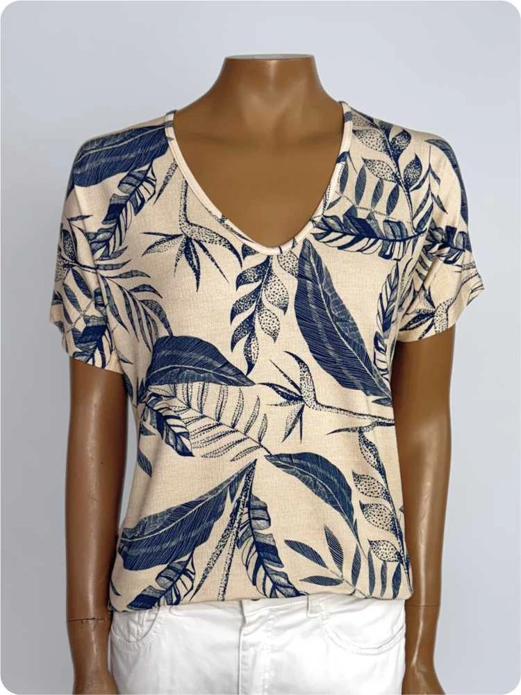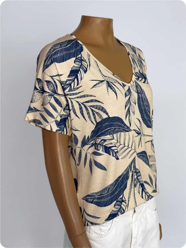 Blusa feminina estampada com folhagens azuis em tecido leve e confortável, ideal para o dia a dia. Seu design com decote em V e manga curta oferece frescor e liberdade de movimento, perfeito para climas quentes e looks casuais. A estampa exclusiva de folhagens traz um toque natural e sofisticado, valorizando qualquer visual com elegância e estilo.