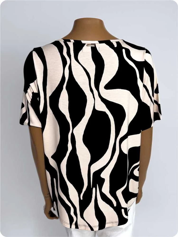 - Cor: Estampa Abstrata em Tons de Preto e Off White