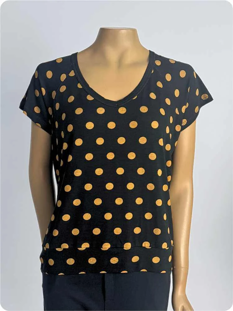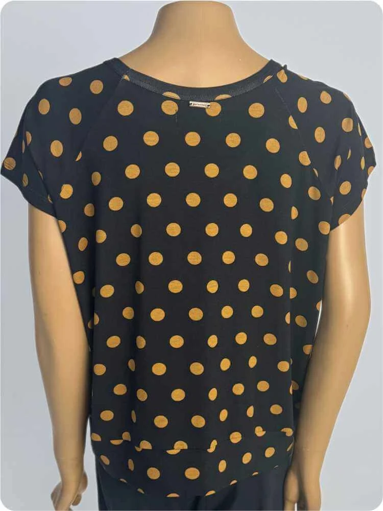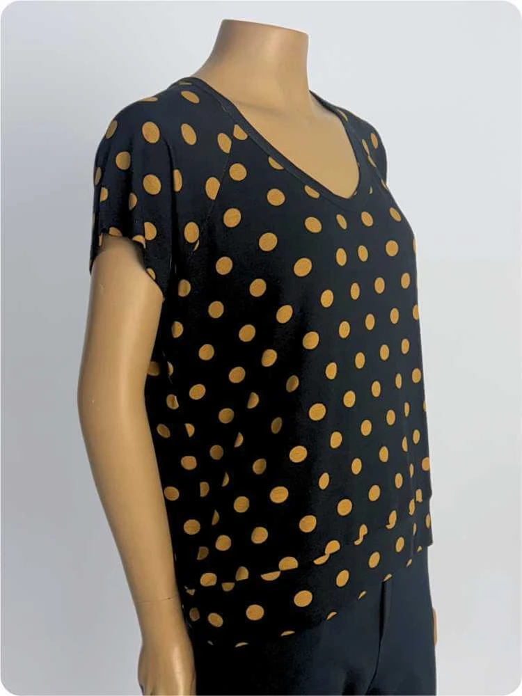 Blusa Feminina Poá Preta Manga Curta (Raglan) Malha Soltinha (com Barra na cintura)