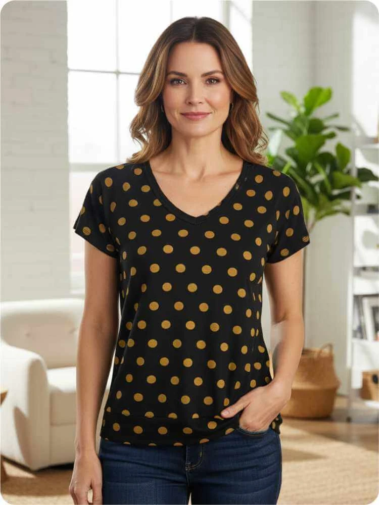 Blusa feminina em malha leve, perfeita para quem busca conforto e estilo no dia a dia. Com estampa de poás em tom mostarda sobre fundo preto, essa peça soltinha proporciona um caimento fluido que valoriza todos os tipos de corpo. A manga curta e o decote em V garantem frescor e versatilidade, tornando a blusa ideal para ocasiões casuais ou para compor looks sofisticados com acessórios. Feita com tecido respirável e de alta durabilidade, oferece liberdade de movimento e fácil combinação com jeans ou calças sociais. Se destaque com uma peça atemporal que une elegância e praticidade.