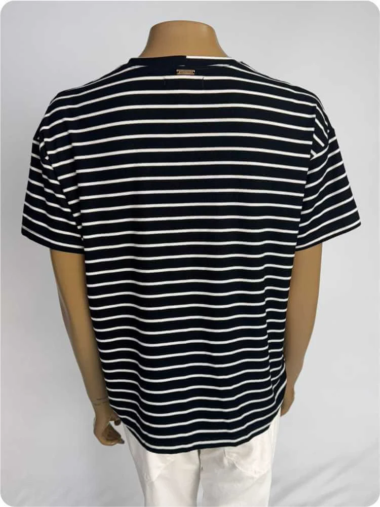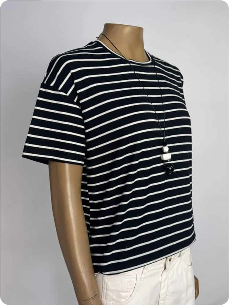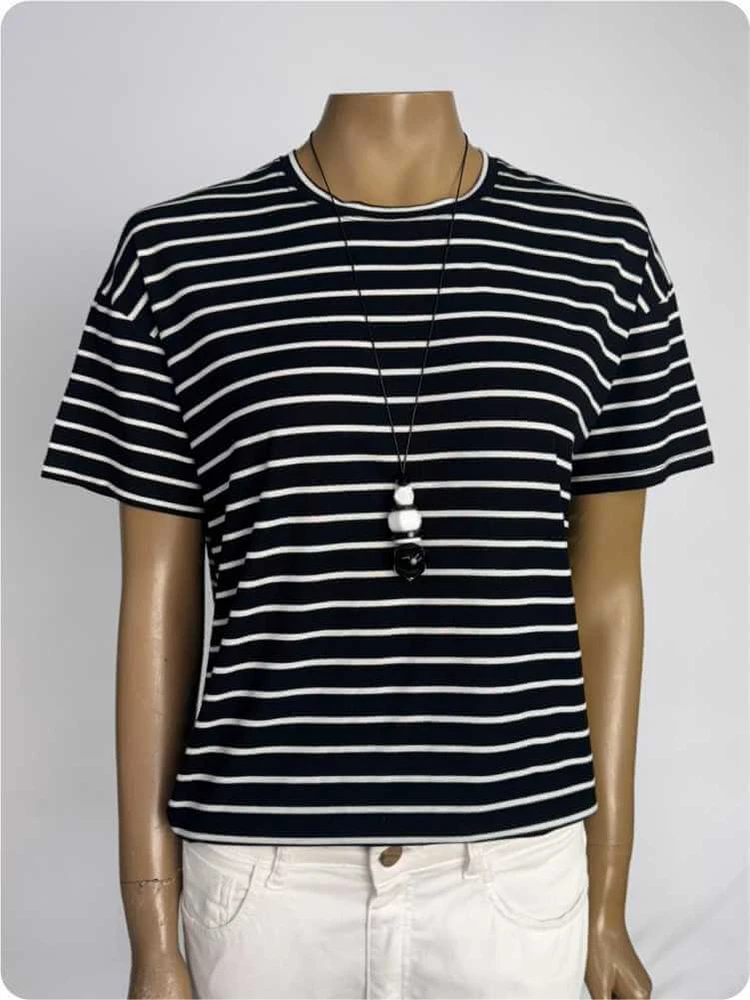 Blusa Feminina Preta Listrada Branca Gola Redonda Soltinha