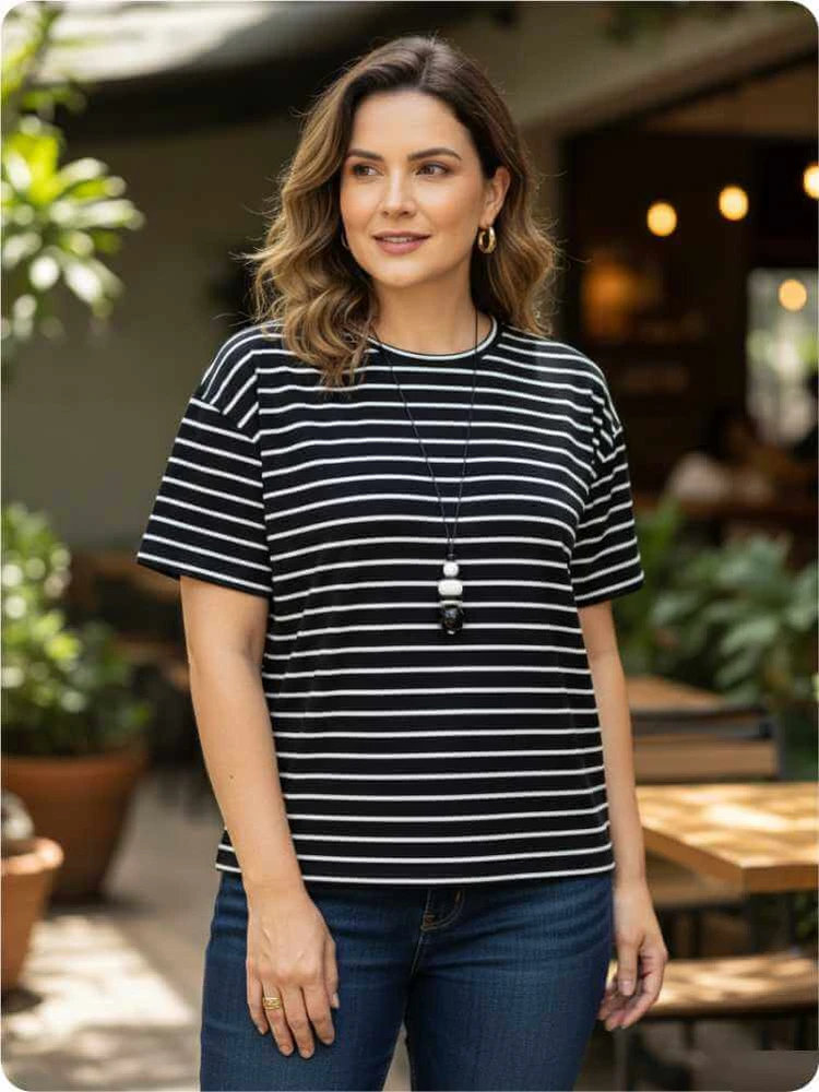 Invista em um básico que une estilo e praticidade, perfeito para quem busca uma peça curinga no guarda-roupa. A blusa listrada é uma escolha confiável para acompanhar seu ritmo com charme e confiança.
