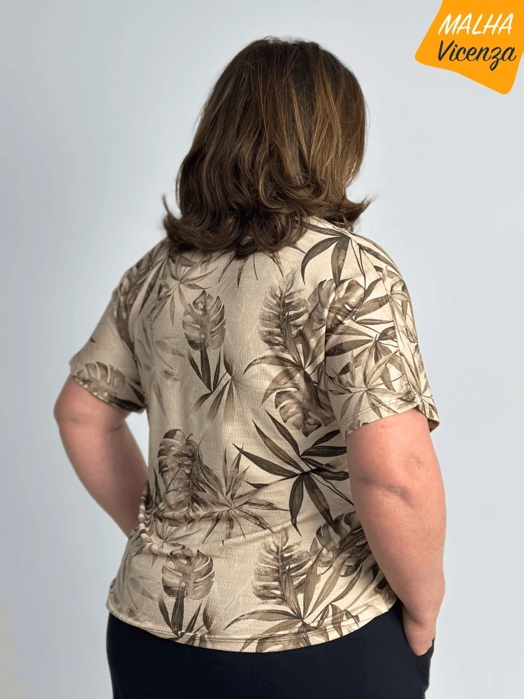 Blusa Bege de Manga Curta Estampada em Malha (MODELAGEM AMPLA)