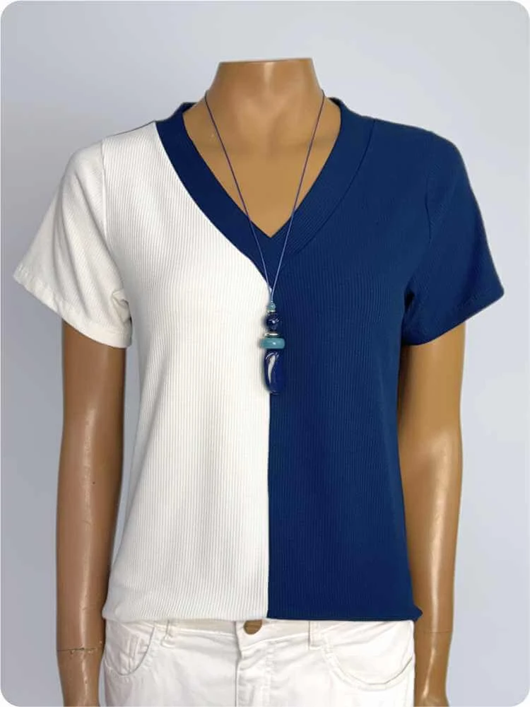 Blusa Gola V Bicolor Azul Malha Canelada Soltinha