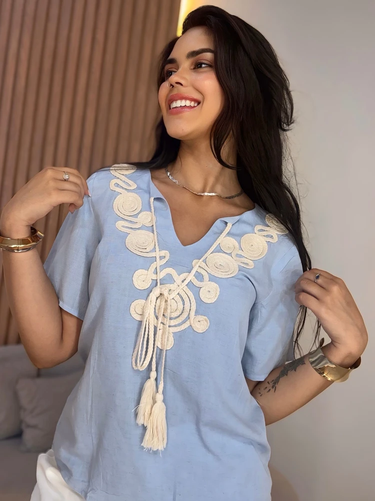 Blusa Lara Linho Bordado Artesanal com Cordão e Tassel