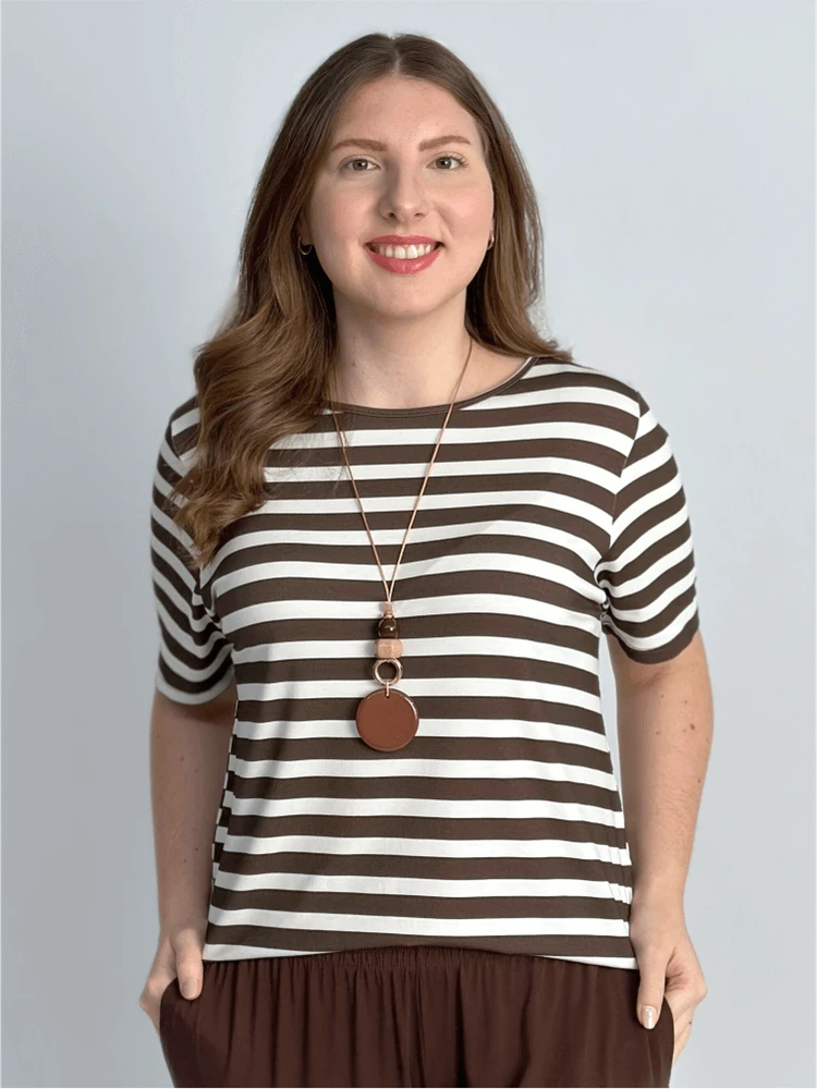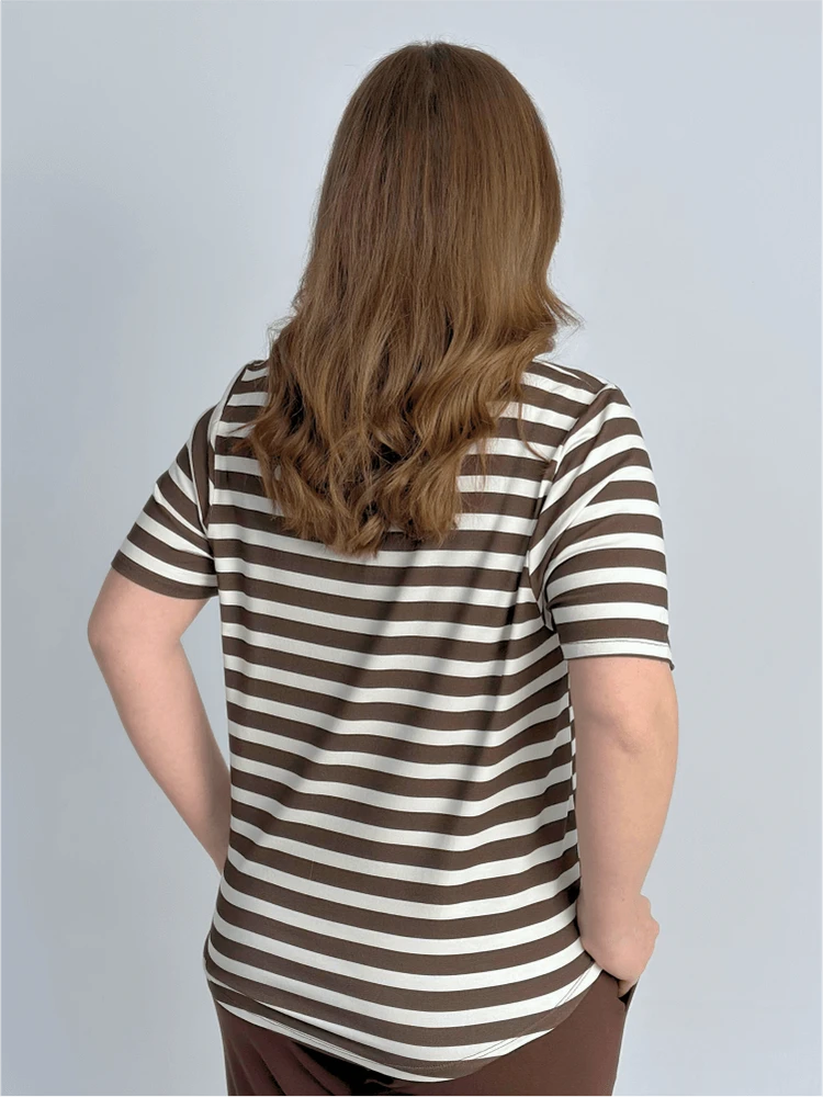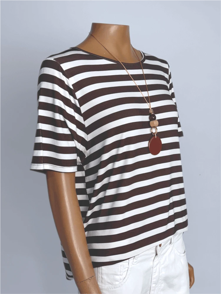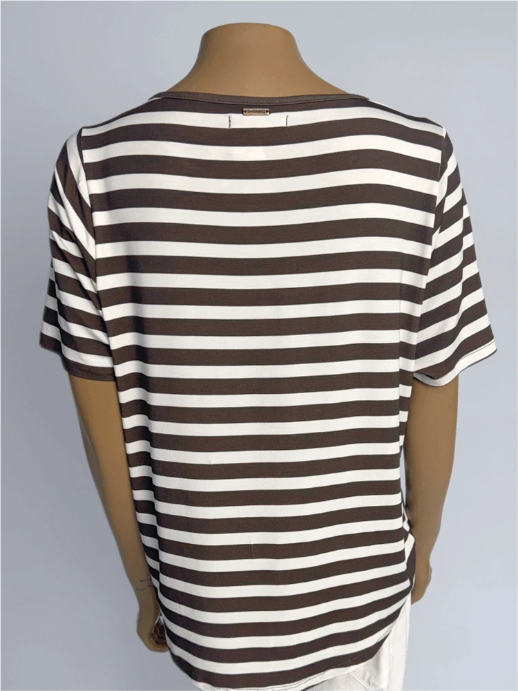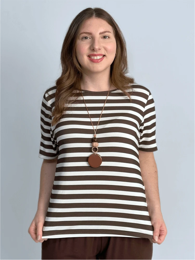 Blusa Listrada Marrom e Branco Manga Curta em Malha Confortável