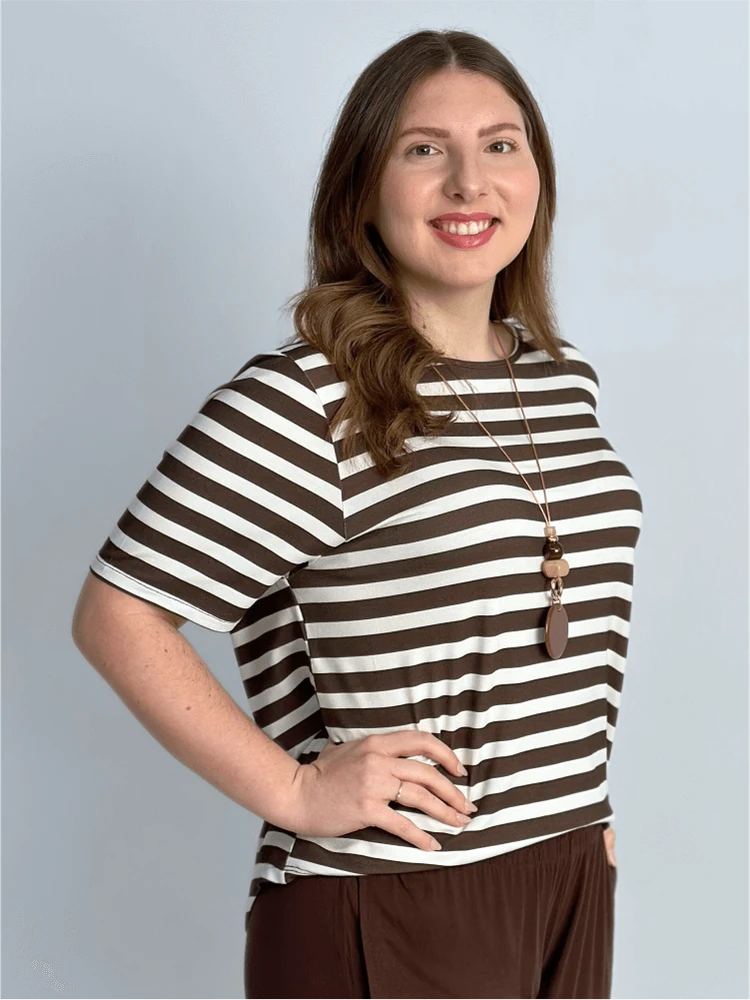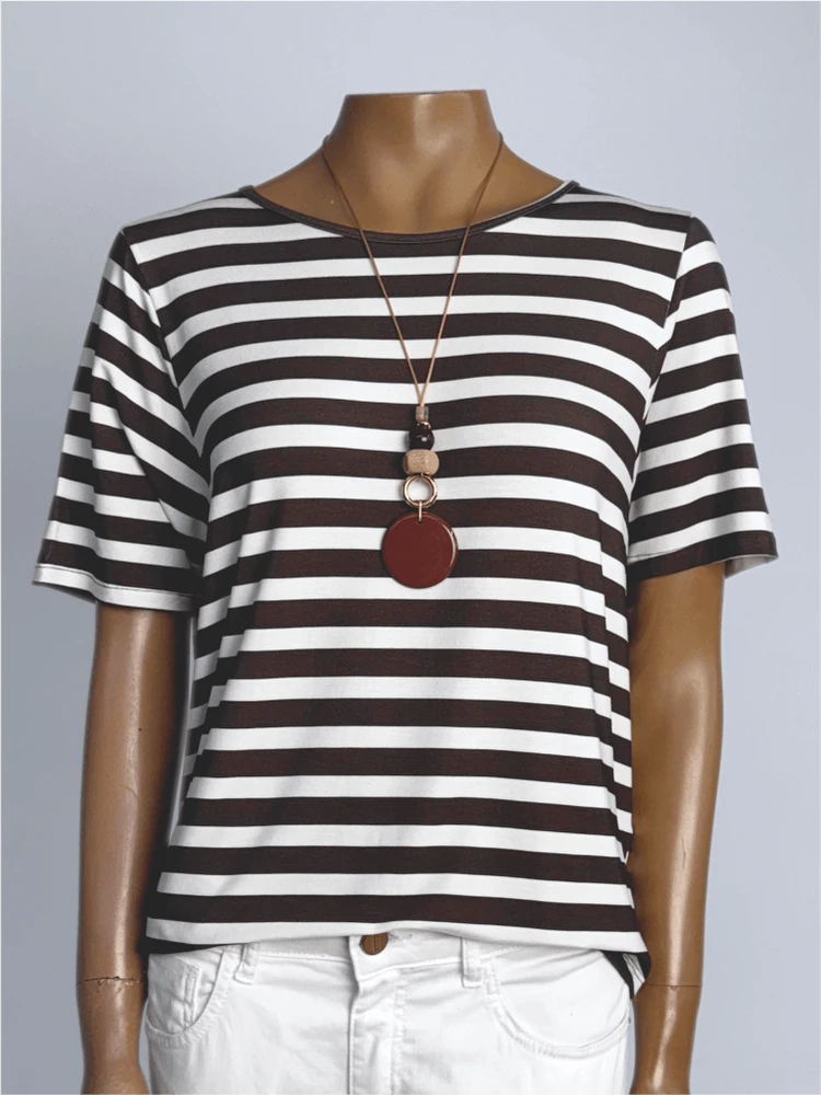 Destaque seu estilo com esta blusa listrada marrom e branco, feita em malha leve e macia que garante conforto o dia todo. A gola redonda e as mangas curtas proporcionam um caimento versátil, ideal para diversas ocasiões, do casual ao trabalho. A estampa clássica listrada traz um toque moderno e elegante, fácil de combinar com jeans, saias ou calças claras.