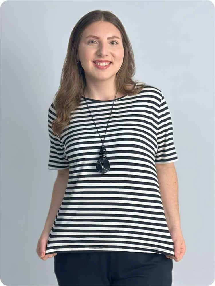 Descubra o equilíbrio perfeito entre estilo clássico e conforto com esta blusa listrada preta e branca. Ideal para quem busca uma peça versátil, a blusa apresenta gola redonda que valoriza qualquer tipo de corpo e mangas curtas que garantem frescor e praticidade em ocasiões informais ou no trabalho.