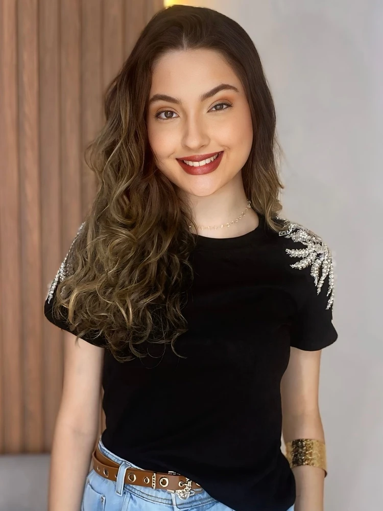 A Blusa Black Pedrarias é a peça perfeita para elevar qualquer look com muito brilho e sofisticação. Confeccionada em tecido macio e confortável, ela traz como destaque as mangas com aplicações luxuosas de pedrarias, que transformam o básico em poderoso.