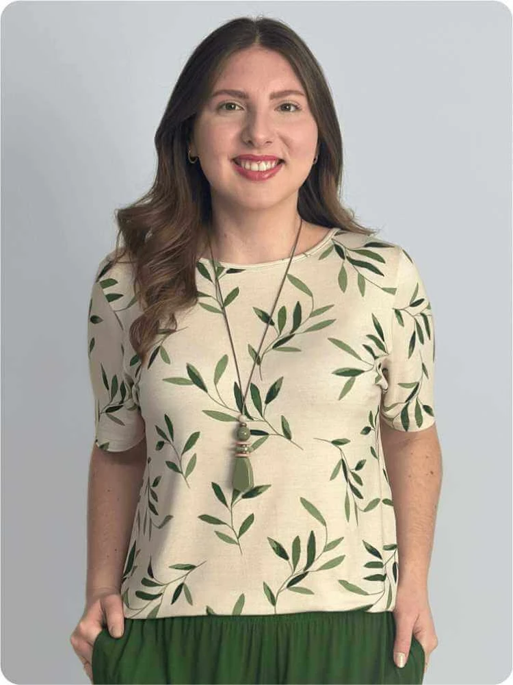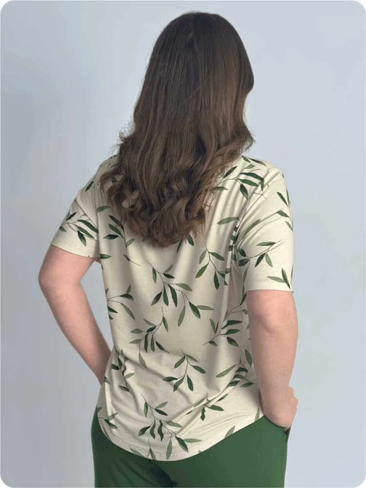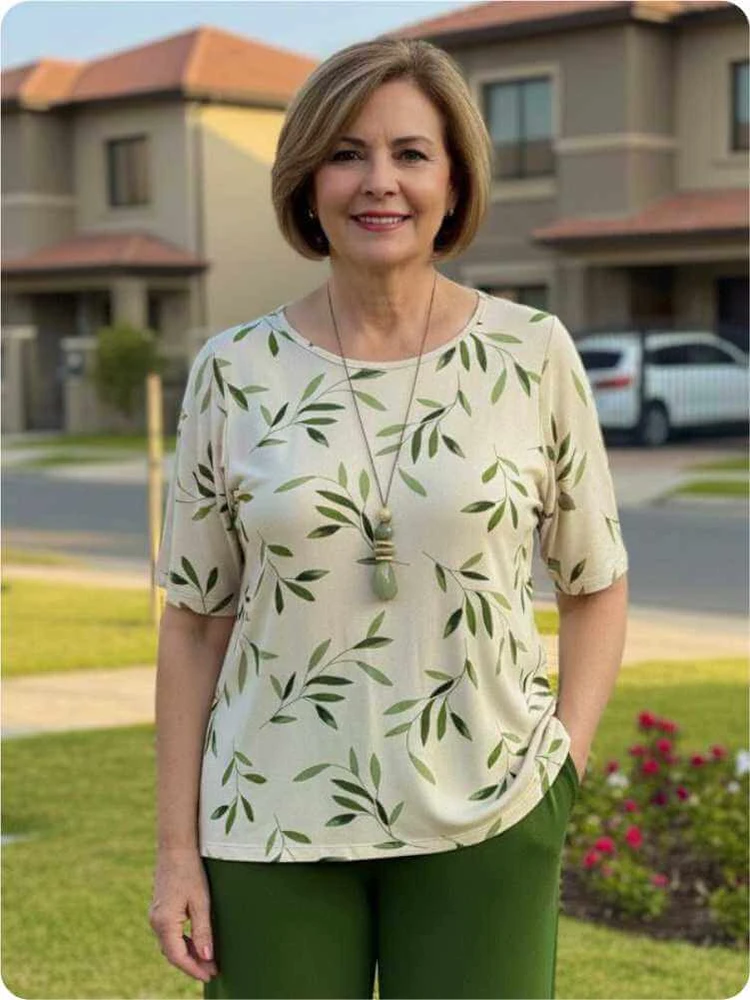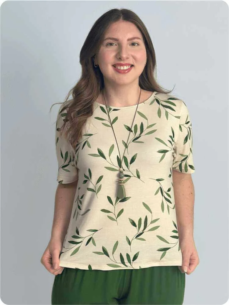 Blusa Manga Curta Off White Estampada Malha Soltinha: conforto e estilo para o seu dia a dia. Confeccionada em malha leve e macia, essa blusa traz um caimento soltinho que permite liberdade de movimento e frescor, ideal para temperaturas amenas. A estampa com folhas em tons de verde destaca a leveza e a conexão com a natureza, oferecendo um toque sofisticado e moderno ao look casual. Com modelagem versátil, é perfeita para combinar com jeans, bermudas ou saias, criando visuais que transitam facilmente do trabalho ao lazer.