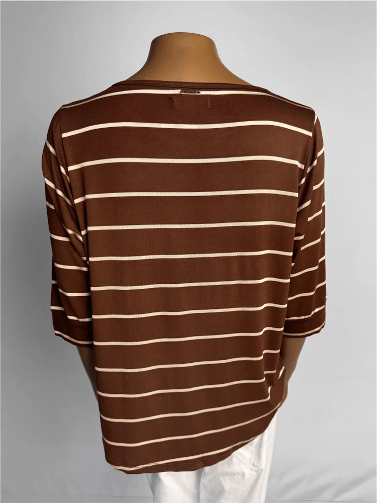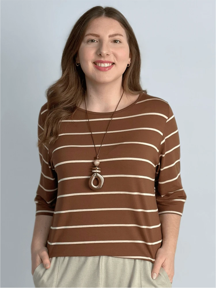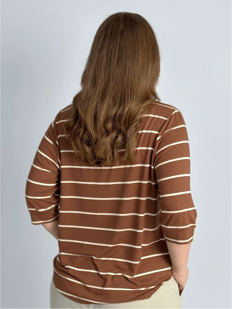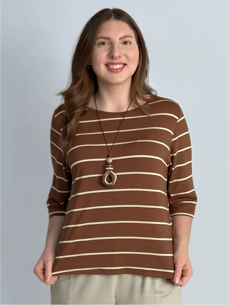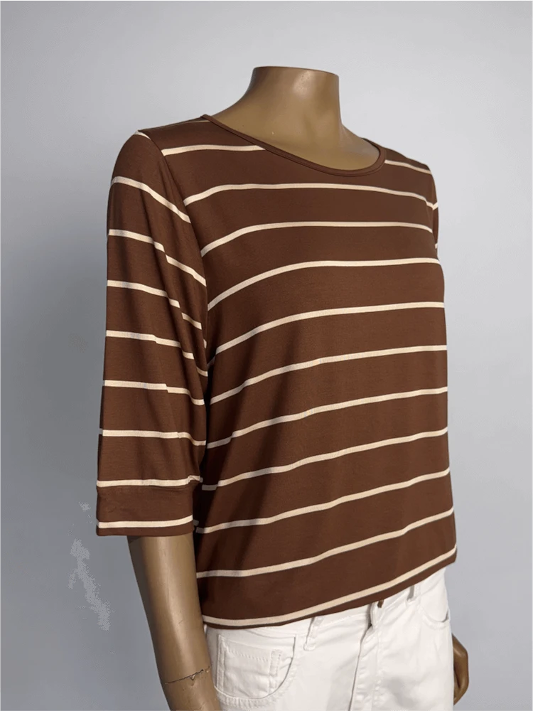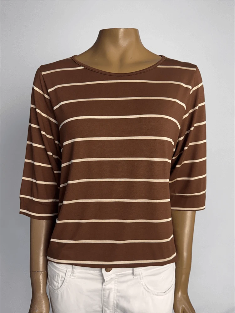 A Blusa Marrom Listrada da Mariantônia foi desenvolvida para mulheres que valorizam estilo, conforto e praticidade em uma única peça. Com meia manga e gola redonda, ela oferece um visual clássico e atemporal, ideal para quem busca sofisticação sem abrir mão da leveza.