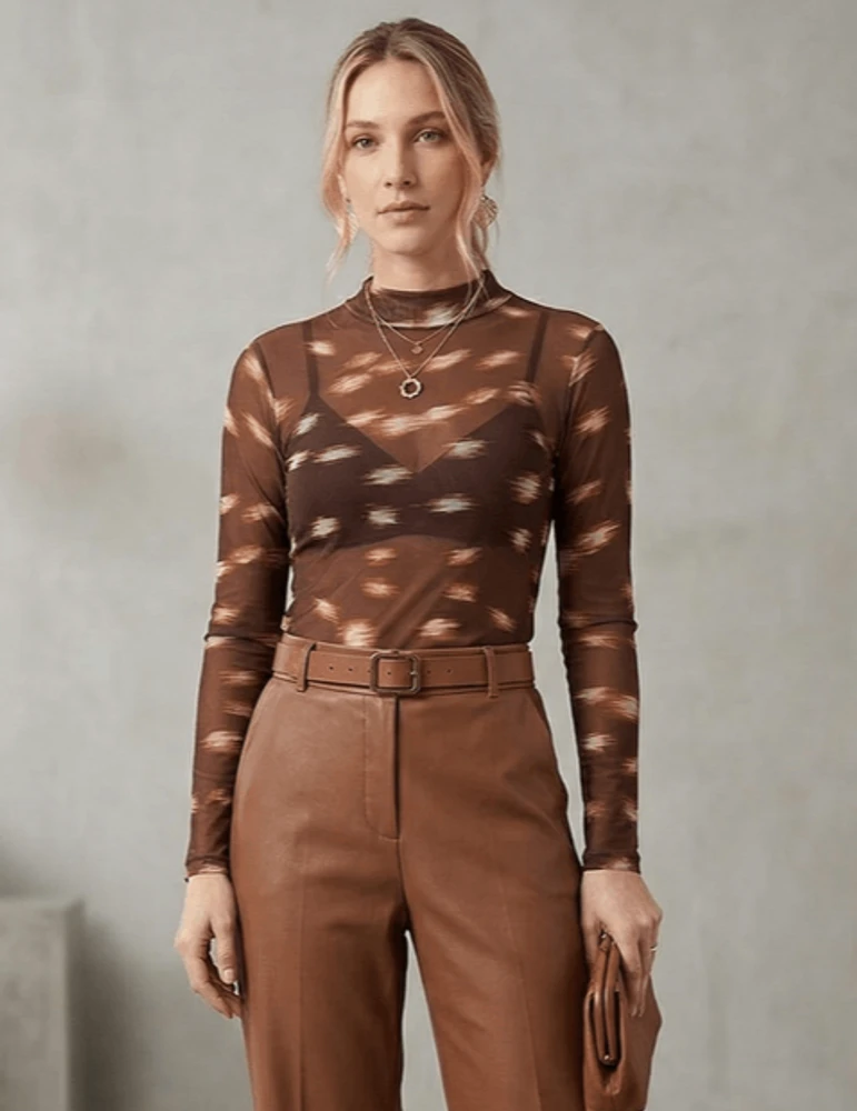 Eleve o seu visual com a sofisticação da transparência. Esta blusa estilo "segunda pele" combina a leveza do tule com uma estampa moderna e artística, perfeita para quem busca um look contemporâneo com um toque de sensualidade discreta.