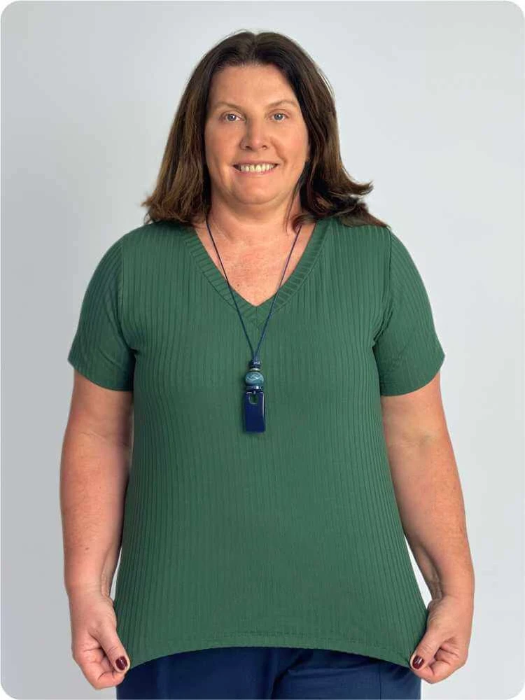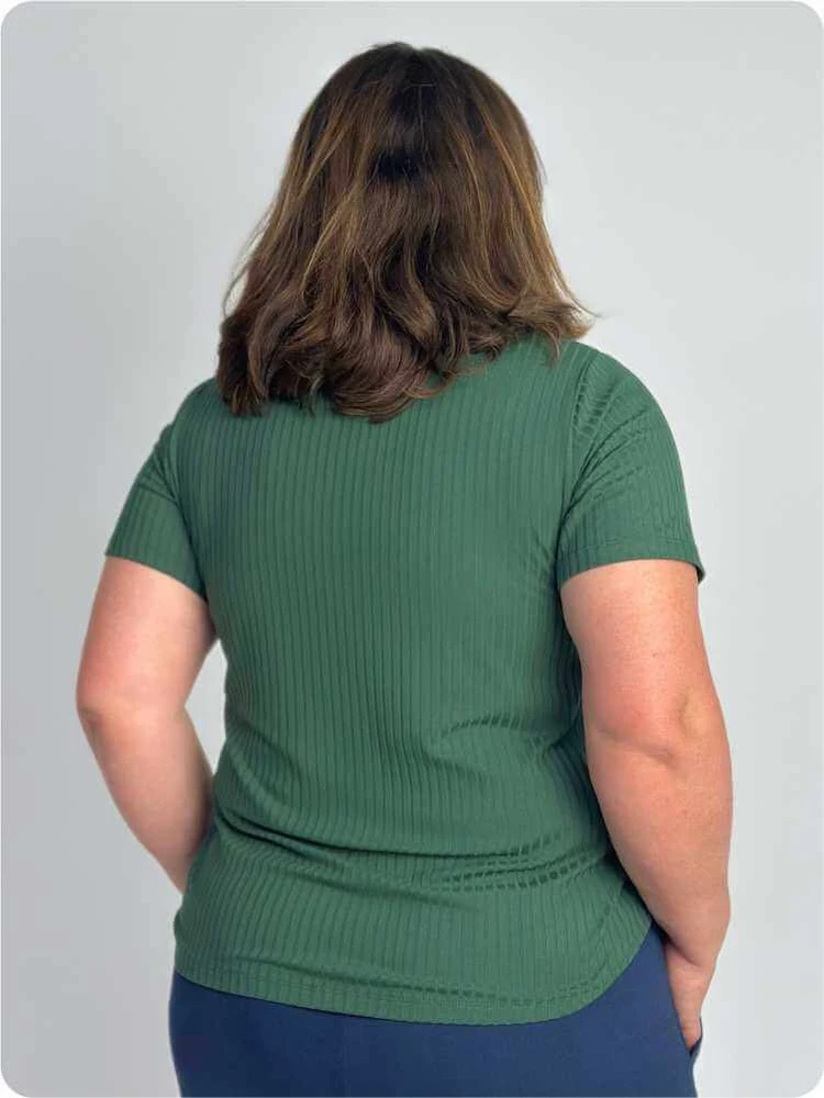 Blusa Verde MALHA CANELADA Manga Curta Gola V Soltinha
