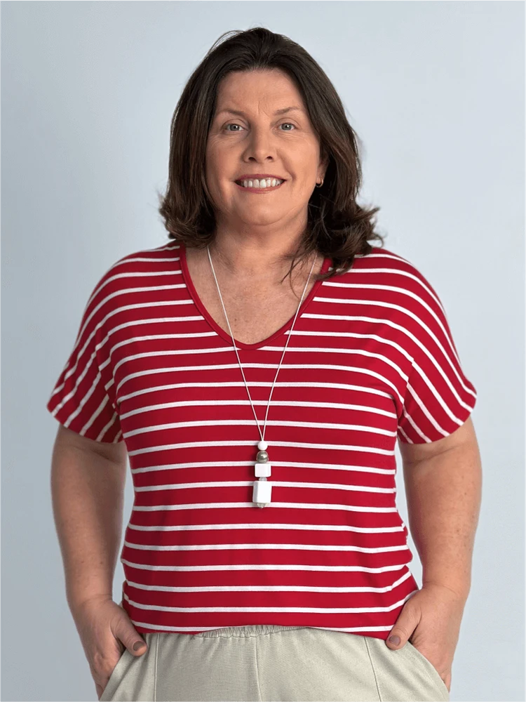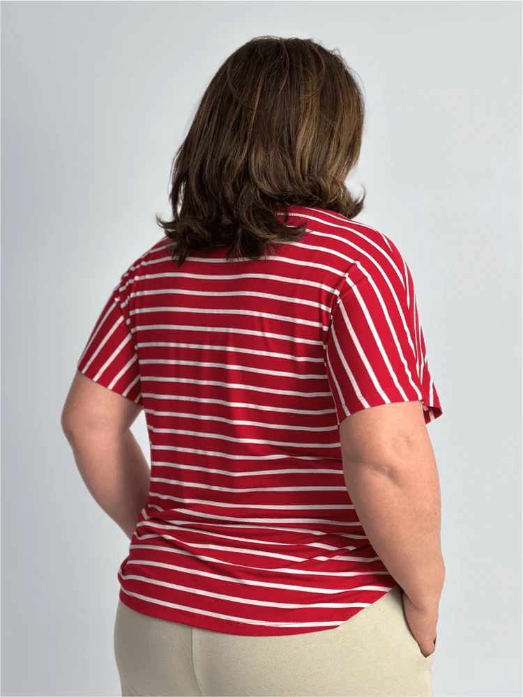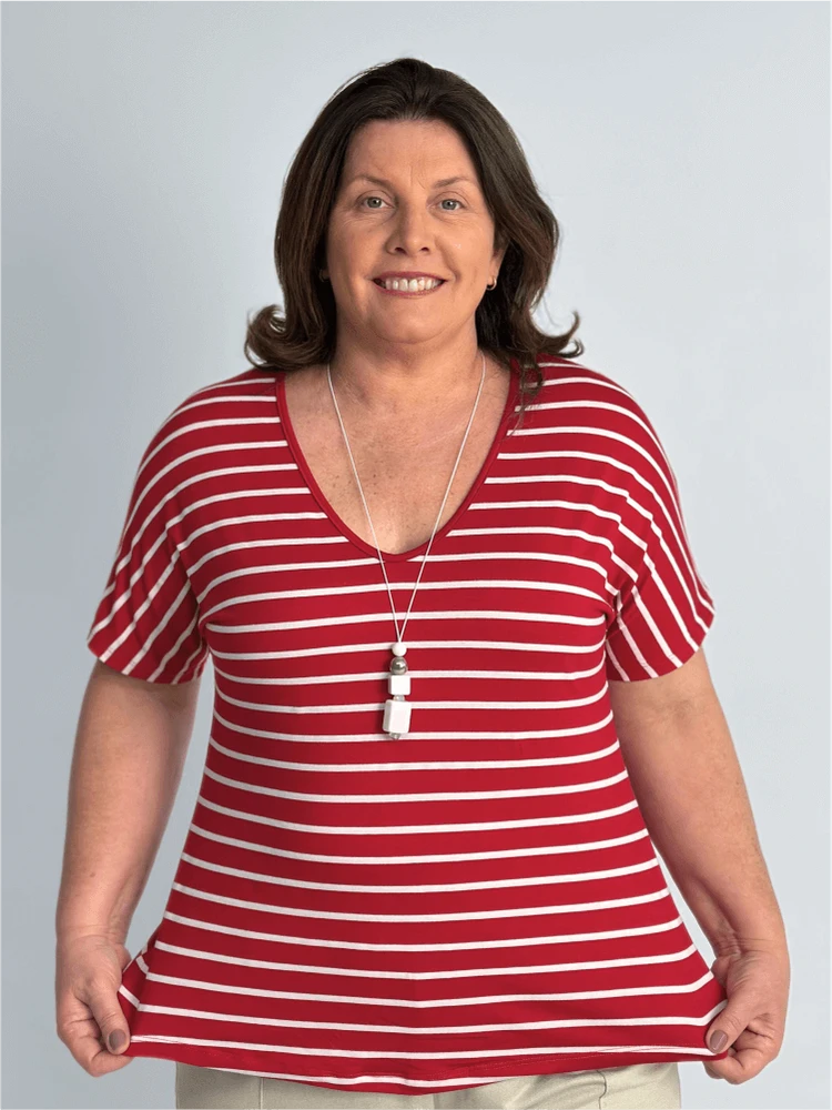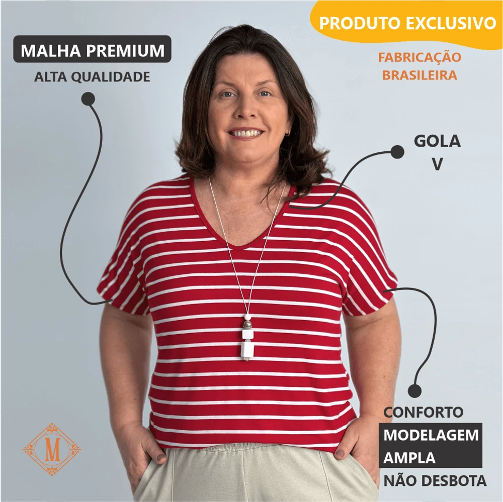 A Blusa Vermelha Listrada Manga Curta Gola V em Malha Soltinha da Mariantônia é a escolha ideal para mulheres que querem se sentir confiantes, leves e cheias de energia — sem abrir mão do conforto. Com estampa listrada em tons de vermelho e branco, essa peça traz um toque vibrante e moderno na medida certa.
