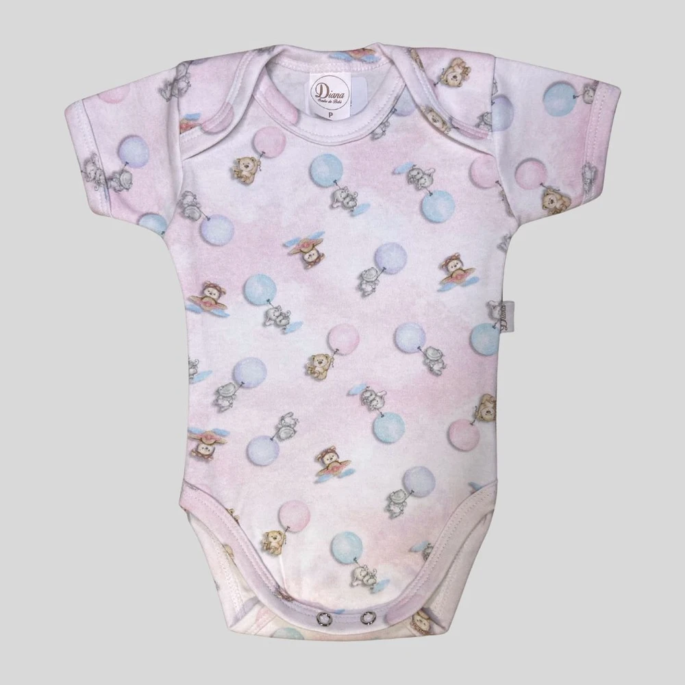 Body curto para bebê em suedine algodão egípcio estampa urso aviador rosa