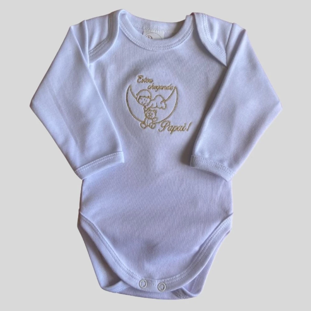 Body longo para bebê em suedine algodão egípcio Branco bordado "estou chegando"