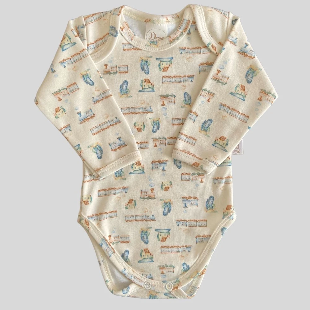 Body longo para bebê em suedine algodão egípcio com estampa trenzinho Amarelo Claro