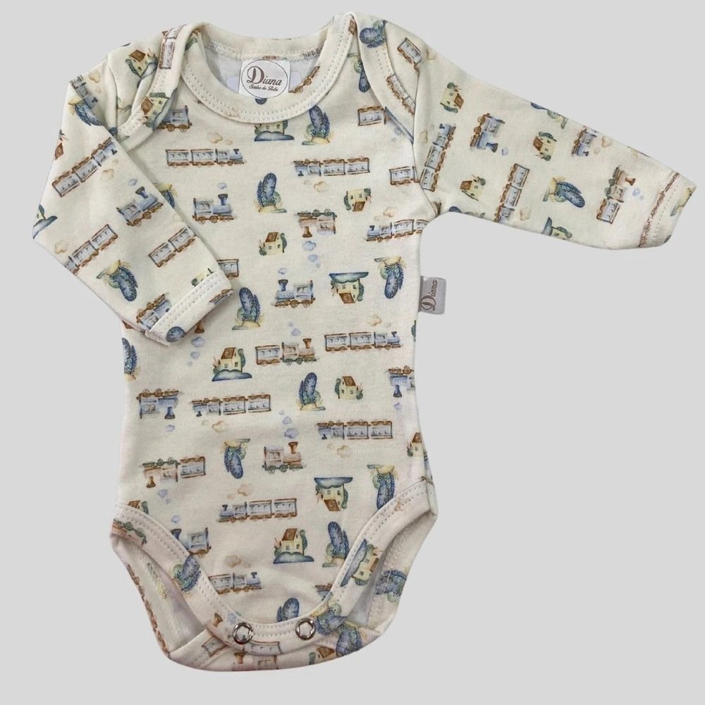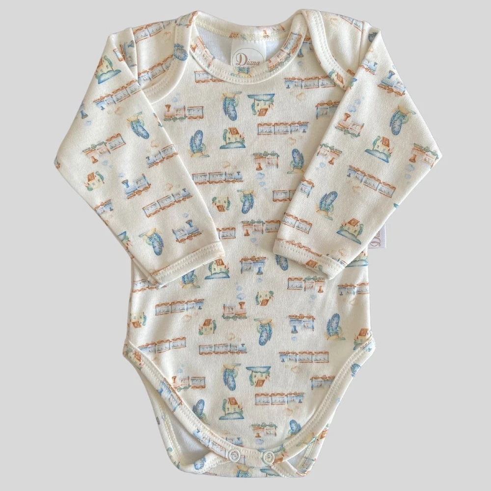 Body longo para bebê prematuro em suedine algodão egípcio estampa Trenzinho Amarelo