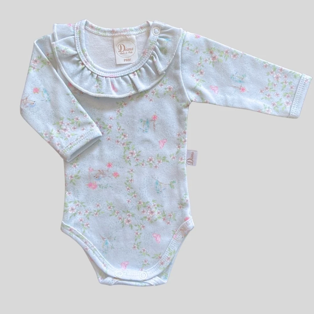 Body longo para bebê prematuro em suedine algodão egípcio com babados na gola estampa jardim Azul Bebê