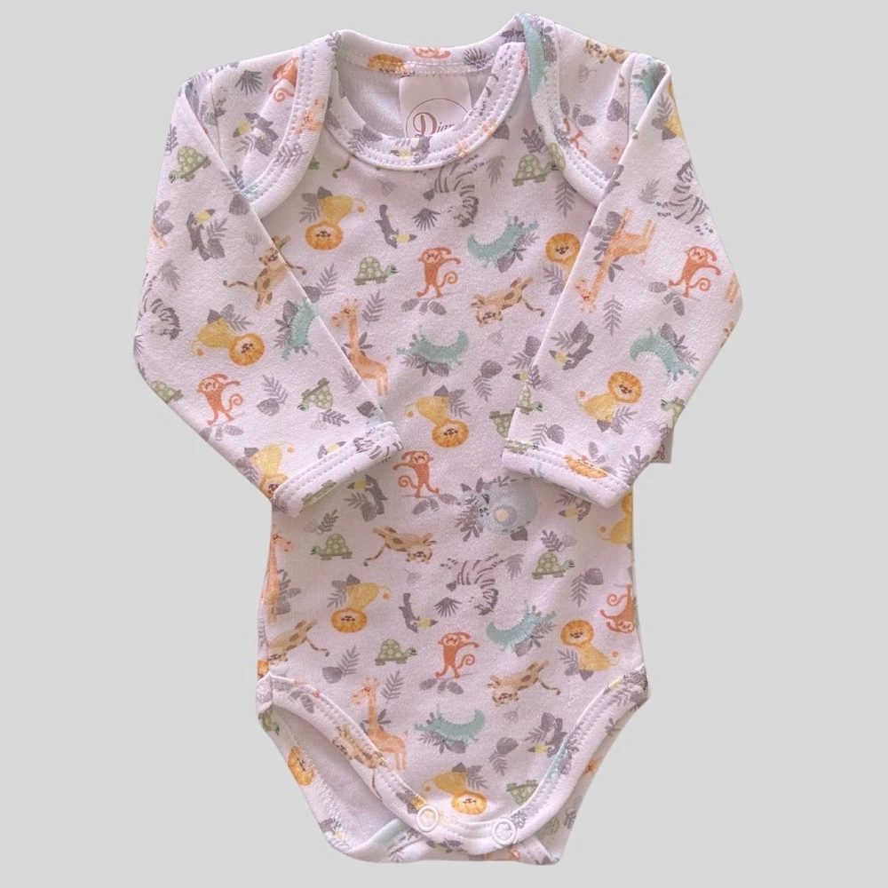 Body longo para bebê prematuro em suedine algodão egípcio estampa safari Branco