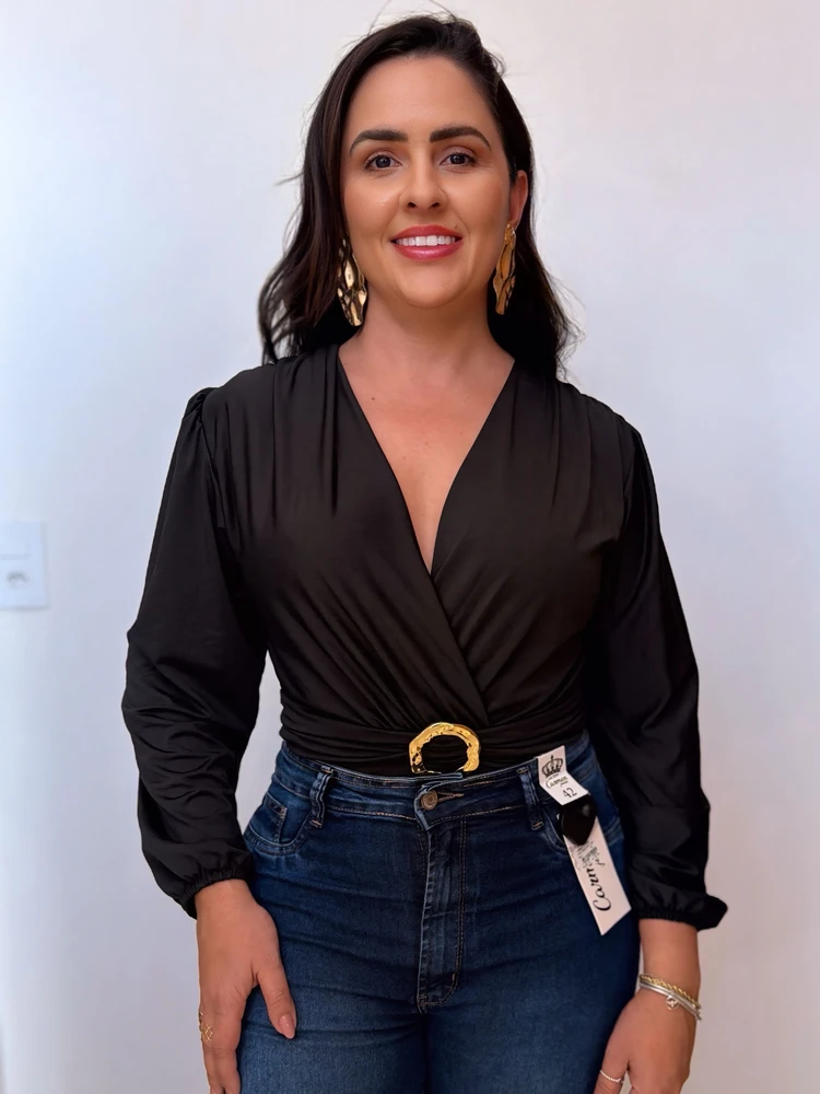 Body sofisticado e versátil, perfeito para compor looks elegantes com praticidade. O modelo transpassado com decote em V valoriza o colo, enquanto a fivela dourada traz um detalhe moderno e diferenciado à peça.