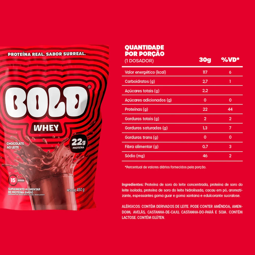 Bold Whey Chocolate é proteína que vai além do shake!Com sua fórmula 3W (Whey Concentrado, Isolado e Hidrolisado), entrega 22g de proteína a cada 30g.Versátil, combina com tudo: bolinho, cookie ou até um sorvetinho fit.Embalagem de 900g para muito sabor e nutrição no seu dia a dia!!