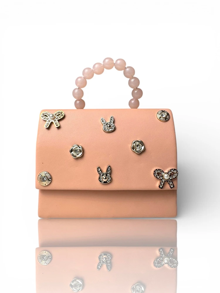 Seu formato retangular oferece bom espaço interno para guardar pequenos objetos, enquanto a alça com pérolas decorativas garante um visual diferenciado e confortável para as mãos. Os detalhes aplicados na parte frontal acrescentam ainda mais charme à peça, tornando a bolsa um verdadeiro destaque no look.