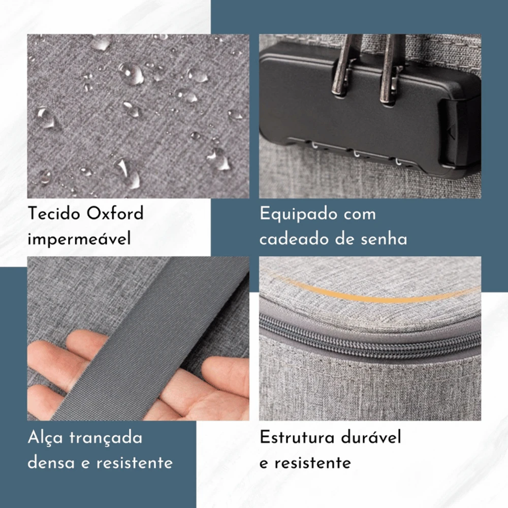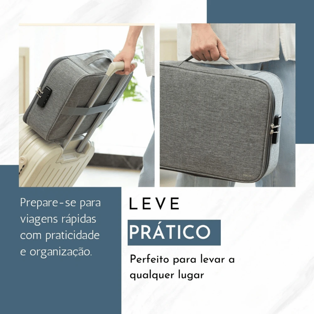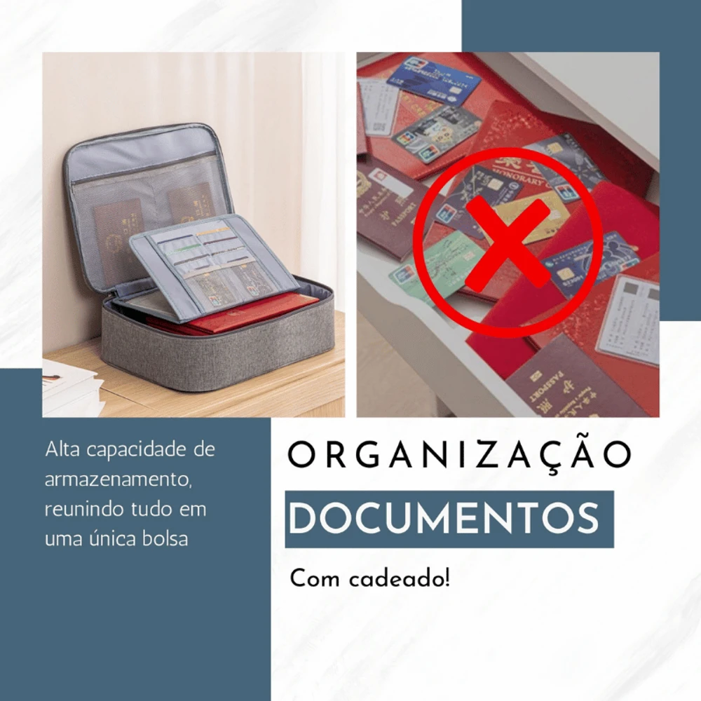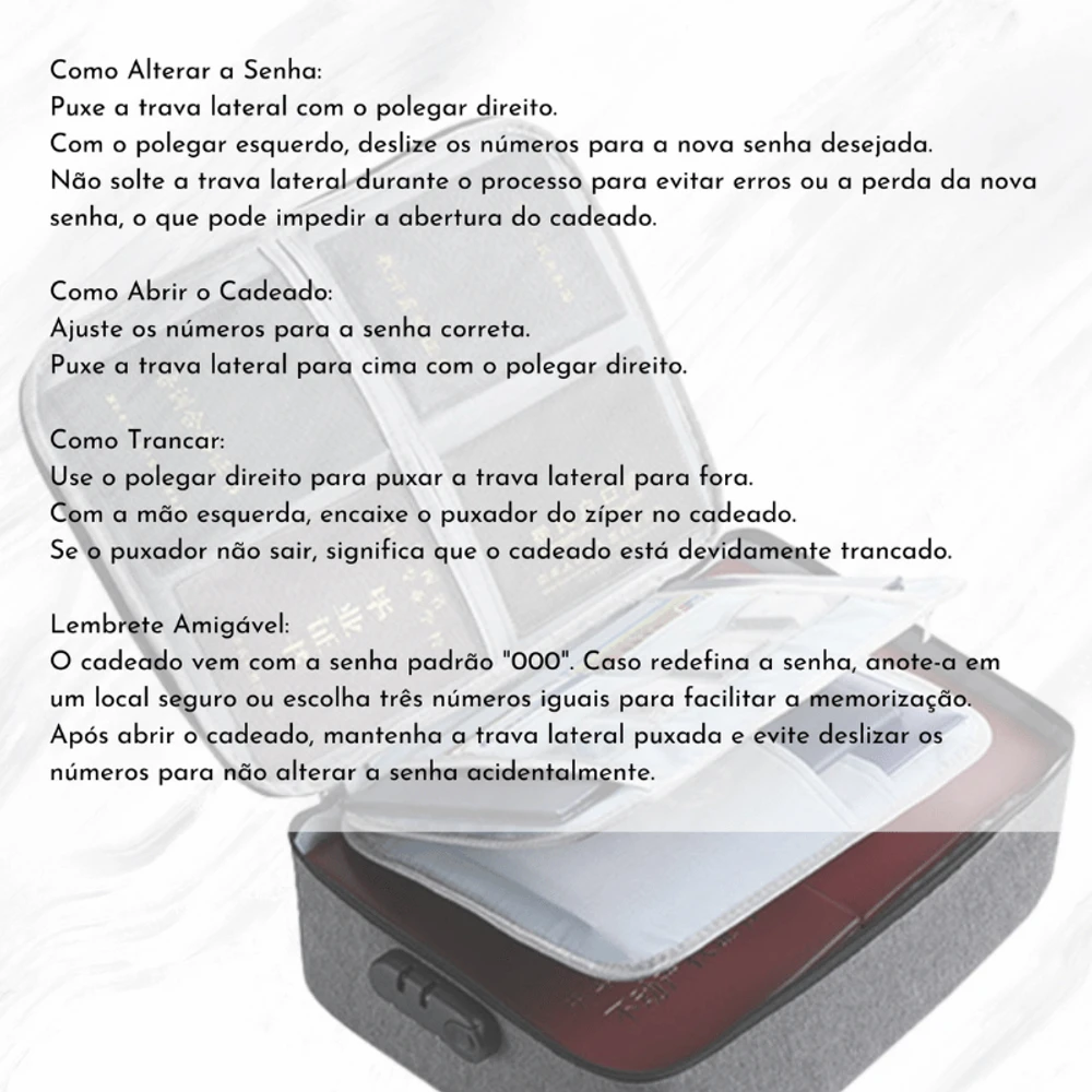 Mantenha seus documentos importantes sempre protegidos, organizados e ao seu alcance com esta bolsa organizadora com fechadura de segredo. Ideal para uso pessoal, viagens ou escritório!