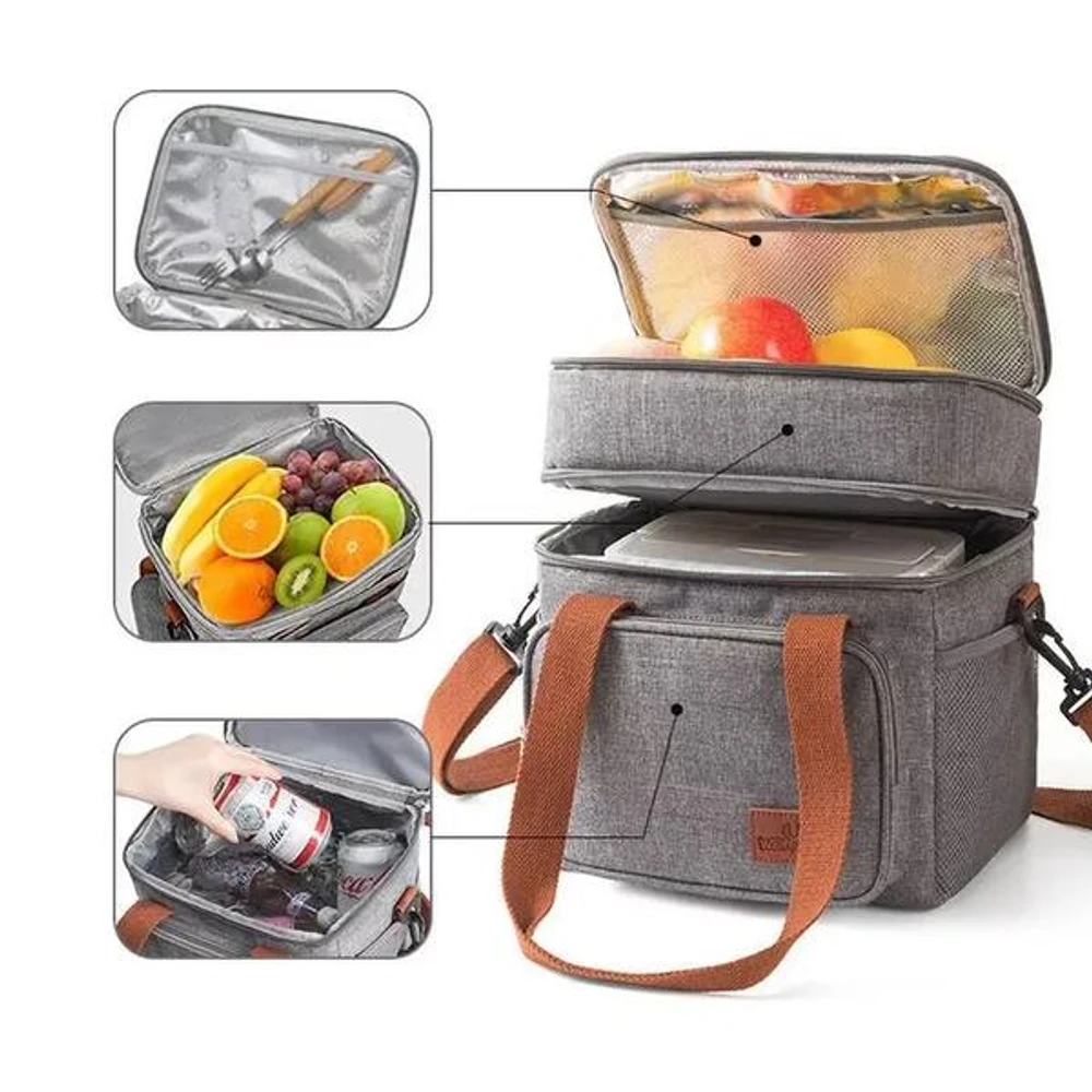 Design de Duas Camadas: Permite separar alimentos e bebidas para melhor organização e conservação térmica.