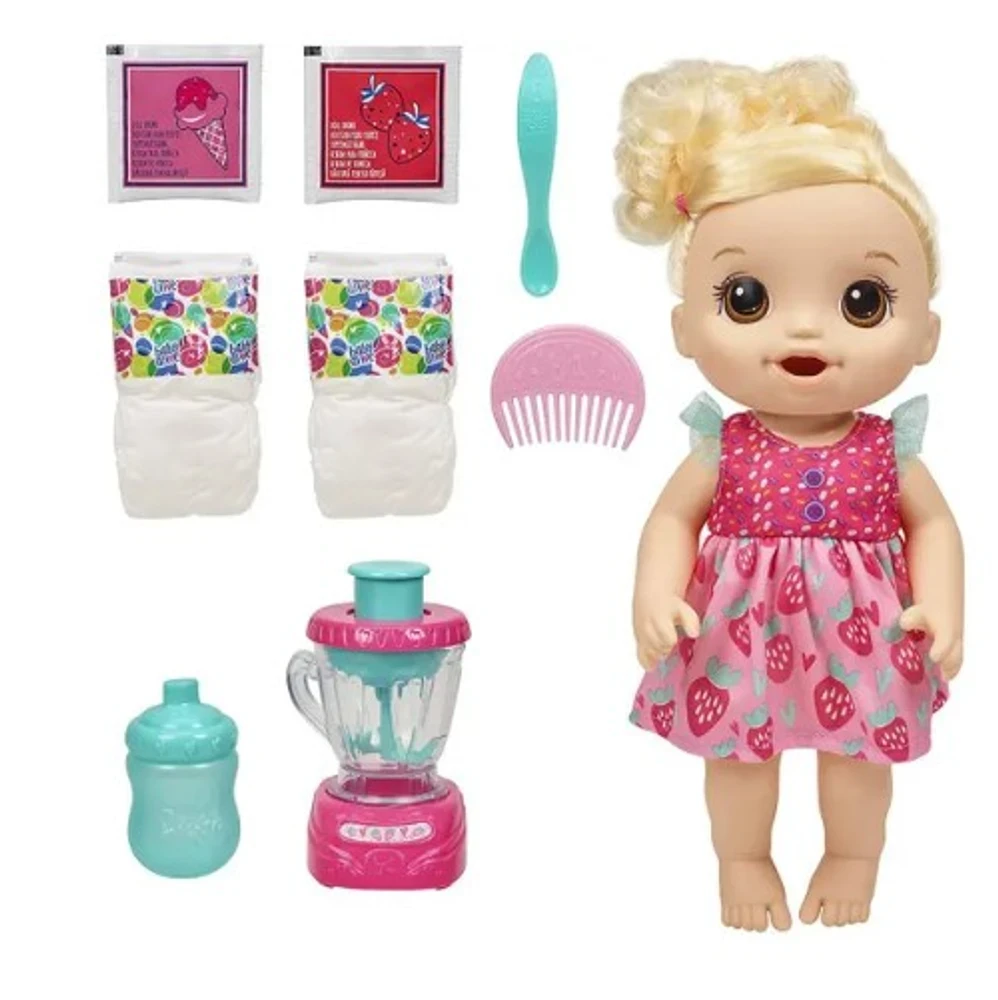 A boneca vem com uma colher e um pente. A boneca bebe água, faz xixi e faz caquinha. Depois de comer, a boneca pode beber água da mamadeira.