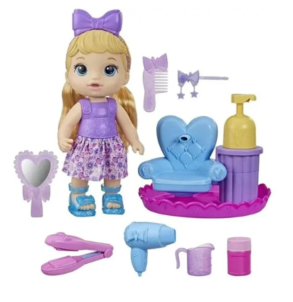 As crianças podem colocar a boneca na cadeira de salão de beleza e criar penteados com as bolhas de sabão. Esta boneca Baby Alive de 30 cm vem com uma cadeira de salão e acessórios como pente, ferramenta de beleza, secador de cabelo, espelho e presilha.