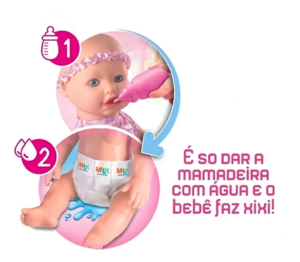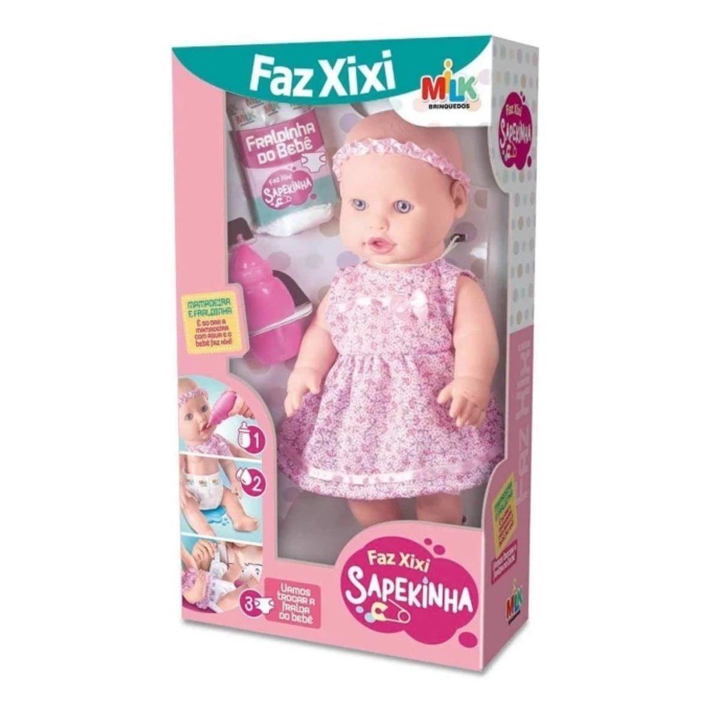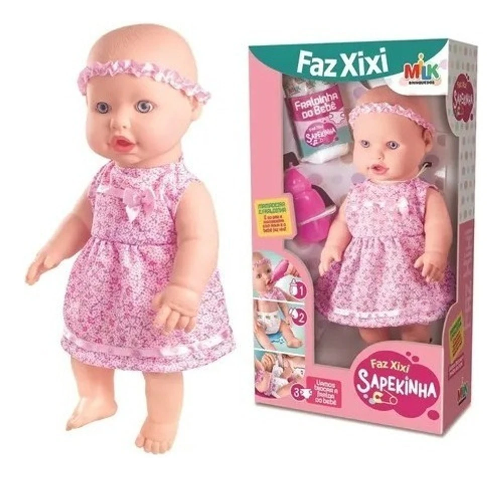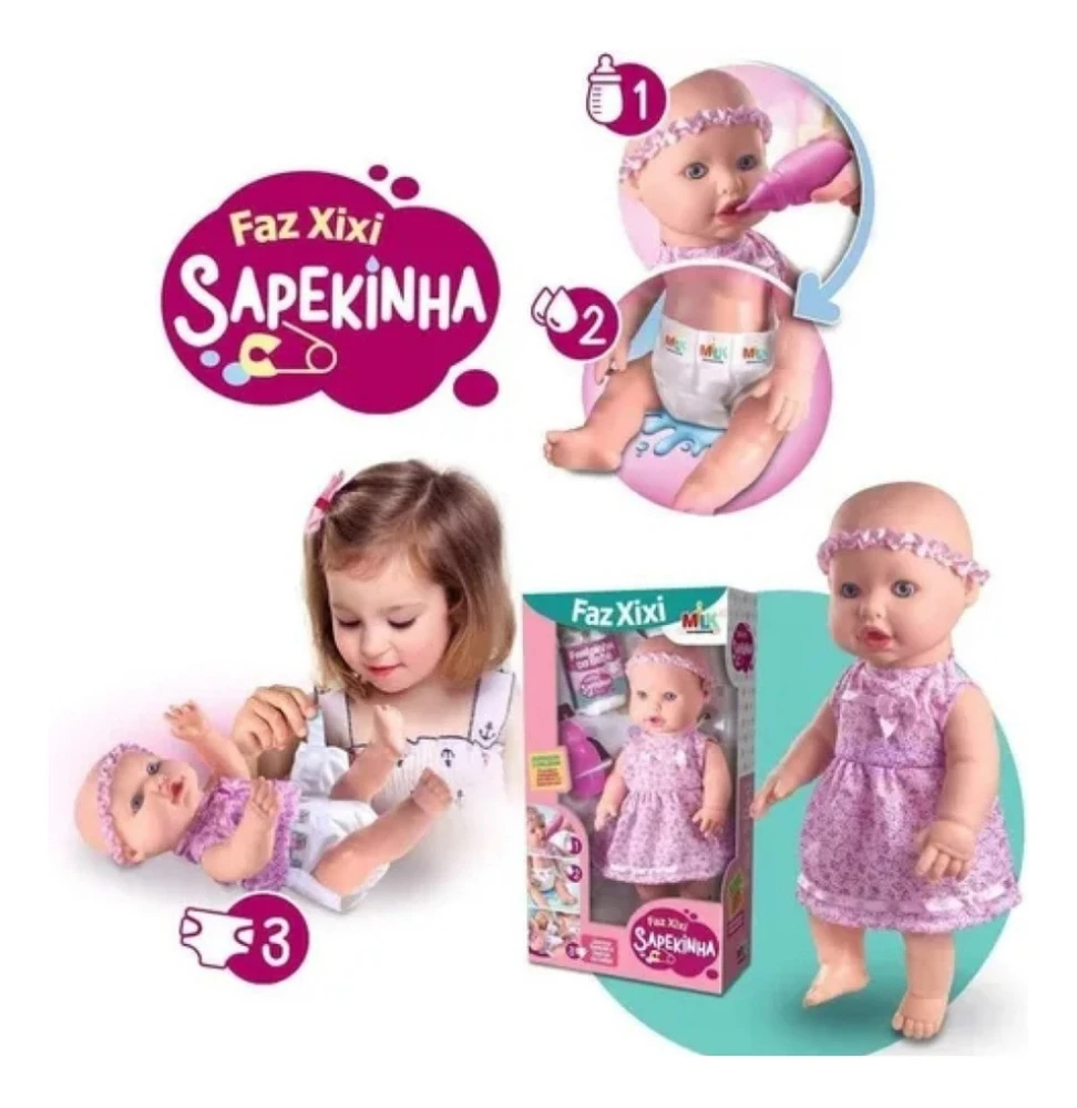 Uma amizade fielA partir de hoje, toda criança será acompanhada por alguém incondicional, capaz de transformar o mundo em um lugar encantador.Personagens inesquecíveisCom Sapekinha, as experiências das crianças serão incríveis! Seu design favorece a criatividade e a imaginação.BONECA SAPEKINHA FAZ XIXI DE VERDADE COM MAMADEIRA E FRALDA - MILK- É só dar a mamadeira com água e o bebê faz xixi de verdade!- Vem com Mamadeira e FraldinhaMarca: Milk BrinquedosIdade recomendada: A partir de 3 anosCertificação do INMETRO: 001540/2019 - OCP 0006Cor: Pode variar com a imagem apresentada. Imagens meramente ilustrativasConteúdo da Embalagem: 1 Boneca, 1 Mamadeira e 1 FraldaDimensões Aproximadas do produto (cm): 34 cm (Altura)Dimensões Aproximadas da embalagem - AxLxC: 41 x 23 x 10 cmGarantia do Fornecedor: 3 mesesReferência do Modelo: 367Código de Barras: 7898283853672