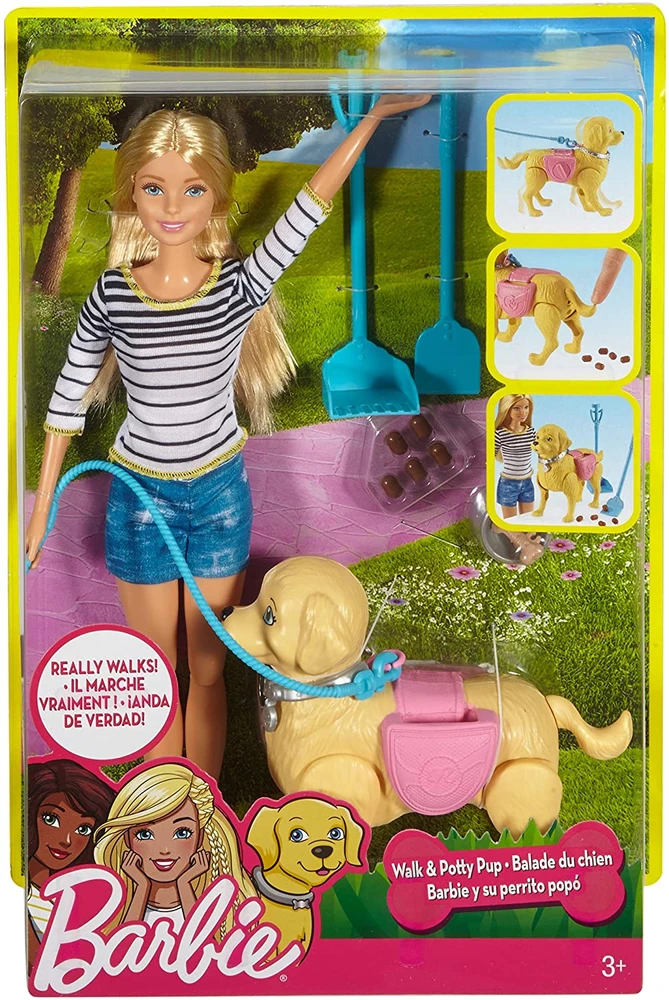 Ajude a Barbie a levar seu cachorro para um passeio, ensinando-o como fazer suas necessidades: basta virar a peça na lateral do cachorrinho e puxar a coleira - o bichinho anda sozinho! E a coleira se encaixa na mão da Barbie, dando um toque a mais de realismo. E, na hora de ir ao banheiro, aperte o rabinho. A Barbie pode limpar a sujeira com a vassoura e a pá inclusas. Vem também com tigela e osso que se encaixa na boca do cachorrinho!