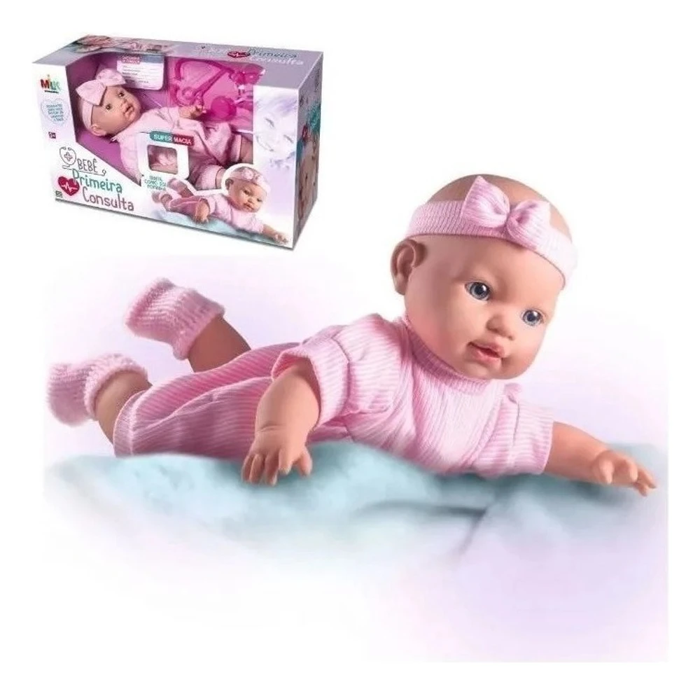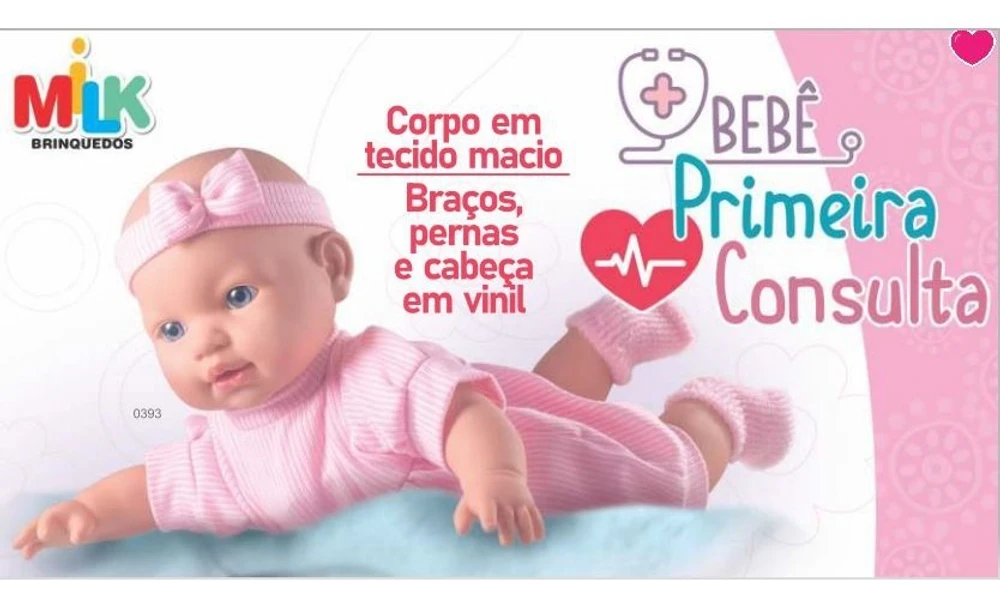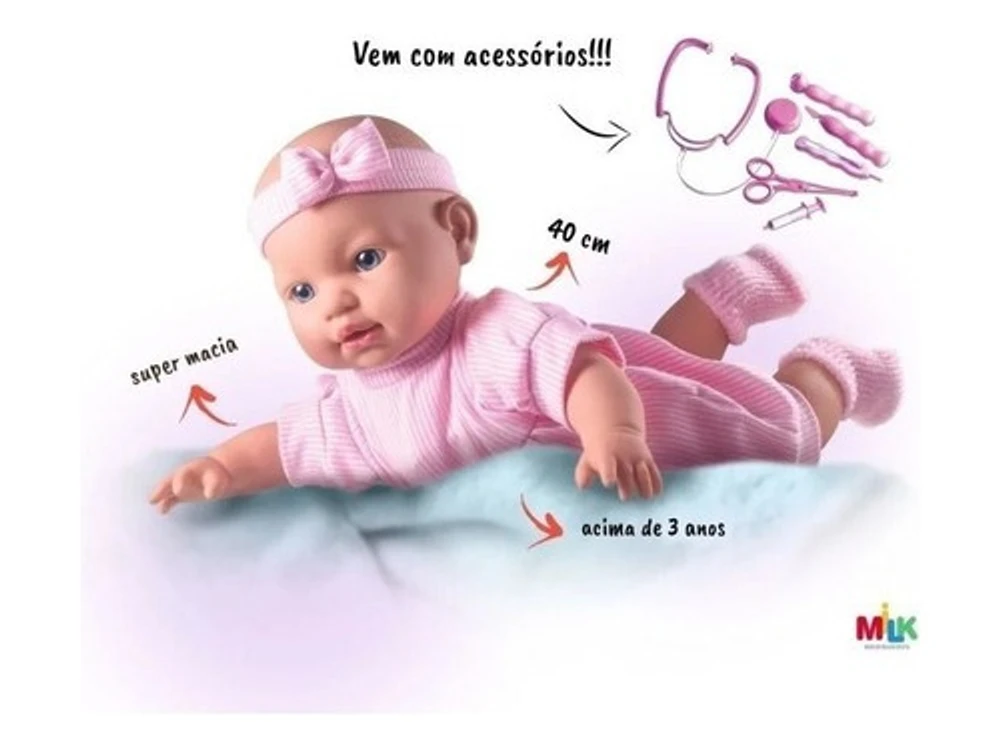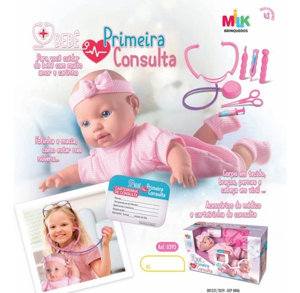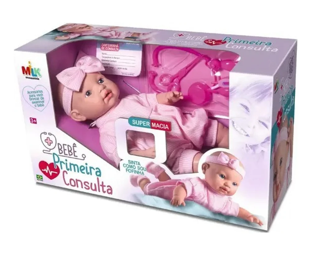 BEBÊ PRIMEIRA CONSULTAEssa linda boneca vem com diversos acessórios médicos para você brincar de cuidar da sua bebê. Vamos brincar de examinar?! Ela é super fofa e macia, gostosa de abraçar e apertar! Chame suas amiguinhas e monte seu consultório de faz de conta e divirtam-se.BENEFICIOS:Estimula a Interação Entre Pais e Filhos, desenvolve a distinção de formas e cores, a comunicação, a coordenação motora, a interação social e cultural...brincando desenvolve-se a criança num todo!Informações:Idade Mínima Recomendada Pelo Fabricante: + 3 anosDimensões Aproximadas da Embalagem (AxLxC): 27 x 18 x 47 cmAltura Aproximadas da boneca: 42 cmDimensões Aproximas dos Acessórios: 7 a 20 cmMaterial: Vinil / Tecido / Plástico / Fibra / PolipropilenoAbre Fecha Olho: NãoCabelo em Todo Coro Cabeludo: Não (careca)Articulada: SimPode Molhar: NãoRoupas e Sapatos Removíveis: SimFala: NãoSom: NãoLuz: NãoPilha/Bateria: NãoFabricante: MILKINMETRO: 001527/2019Conteúdo da Embalagem: 01 Boneca + 01 conjunto médico c/ 6 peçasAs cores do tecido ou desenhos do produto podem variar de acordo com o lote de fabricação.