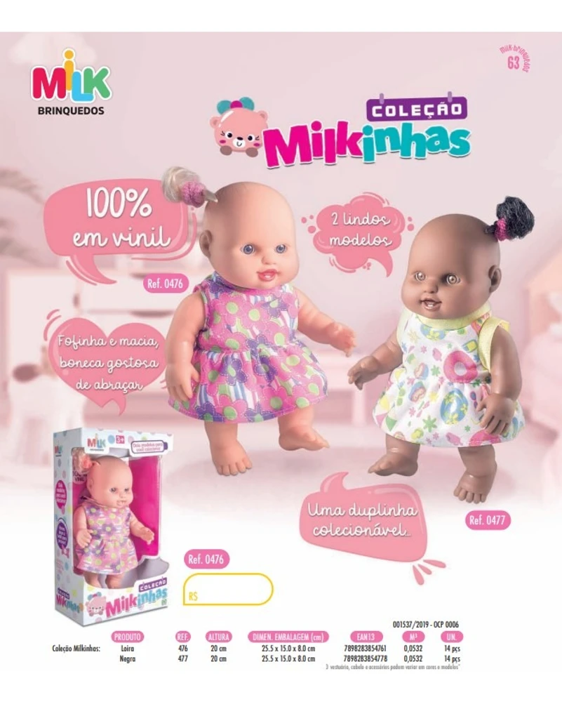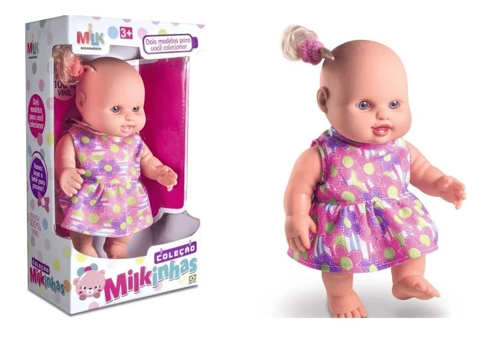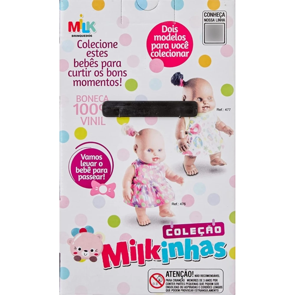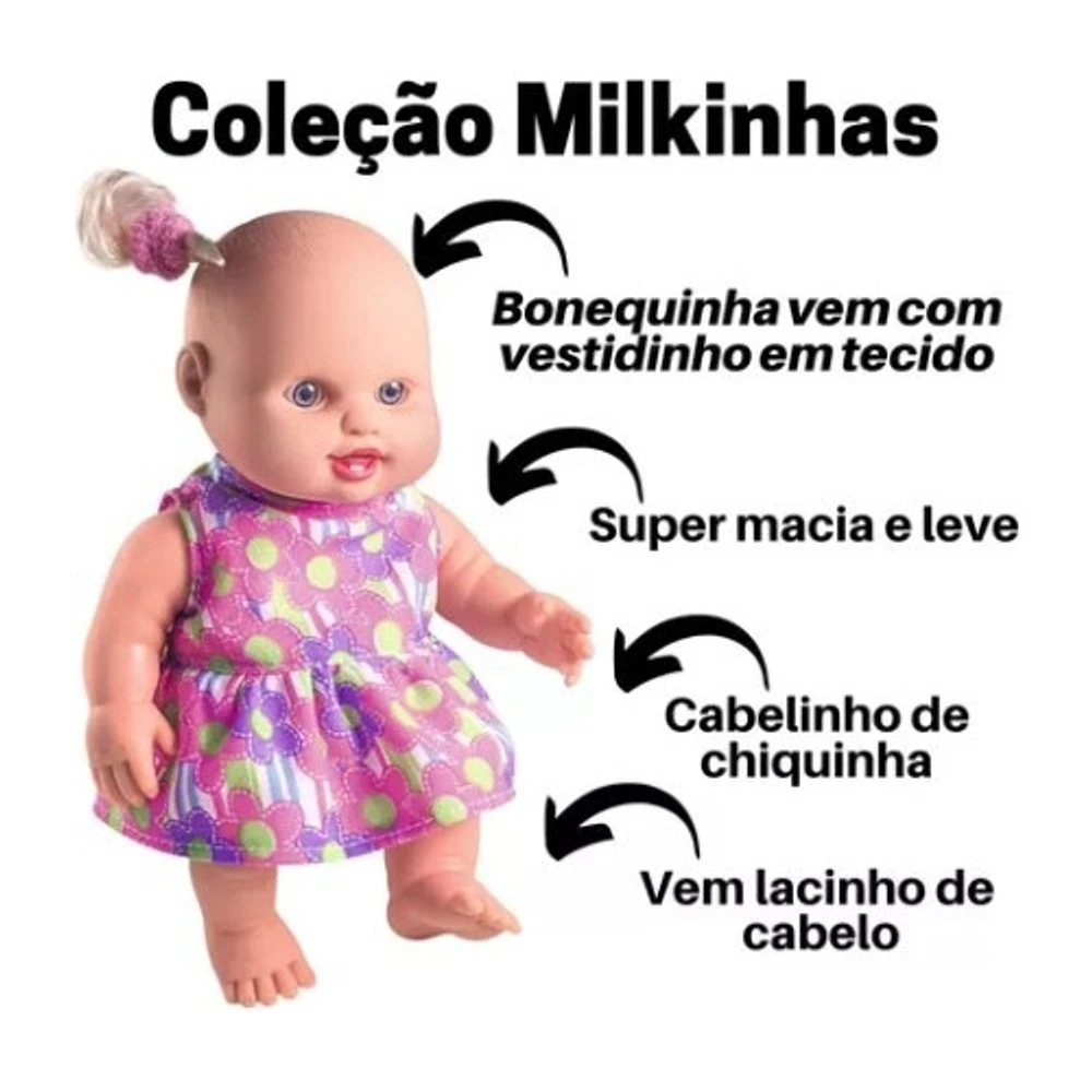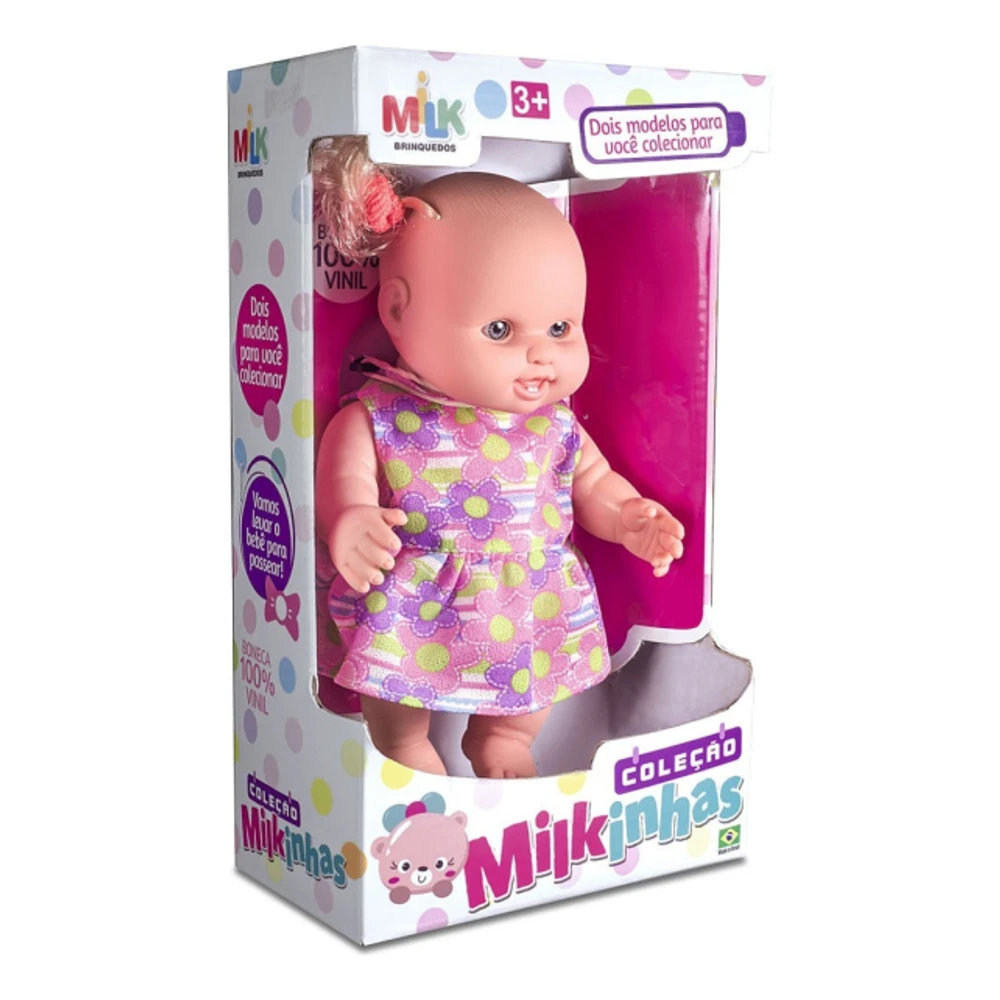 BONECA COLEÇÃO MILKINHAS ? MILK BRINQUEDOSUma amizade fiel.Boneca Milkinhas vem com um lindo vestidinho de flores e com o cabelinho amarrado.Boneca bebê vem com dois dentinhos, macia, boa para abraçar e apertar.Uma linda boneca que vai encantar as garotinhas!As meninas vão amar!Estimula coordenação motora, criatividade e imaginação da criança.ESPECIFICAÇÕES:Marca: Milk BrinquedosPersonagem: Coleção MilkinhasMaterial: Vinil e PlásticoIdade: +03 anosAltura: 20cmLargura: 15cmCom Som: NãoCom Pilha: NãoCom Luz: NãoCertificado pelo InmetroRegistro: 001537/2019Segurança Inmetro: CE-BRI/ICEPEX-N 01262-14MEDIDAS DA EMBALAGEM:Altura: 25,5cmLargura: 15cmComprimento: 8cmPeso: 126gCONTEÚDO DA EMBALAGEM:01 Boneca01 RoupinhaAtenção: As cores podem variar entre as imagens mostradas acima e o produto. Imagens meramente ilustrativas.Obs.: Não recomendável para crianças menores de 03 anos, por conter partes pequenas que podem ser engolidas.